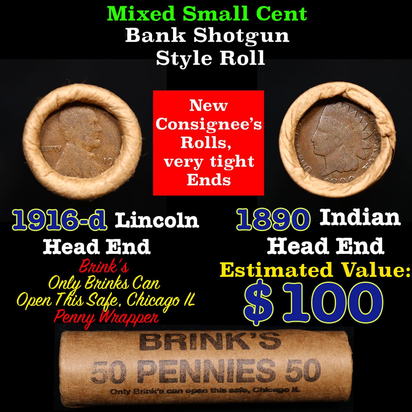 Mixed small cents 1c orig shotgun roll, 1916-d Wheat Cent, 1890 Indian Cent other end, Brinks Wrapper. The roll is held in an old Rare & Collectable Brinks Wrapper. Actual roll pictured is the roll you will get. A great original bank shotgun roll with very tight ends. We have opened a few of these rolls. They seem to be mixed small cents including Indians, Wheats, Steel cents & some Flying Eagles mixed in. These shotgun rolls are all from a new consignee. They are all frrom one Estate.