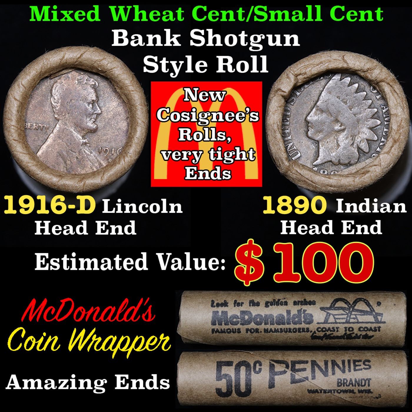 Mixed small cents 1c orig shotgun roll, 1916-d Wheat Cent, 1890 Indian Cent other end, McDonalds Wra