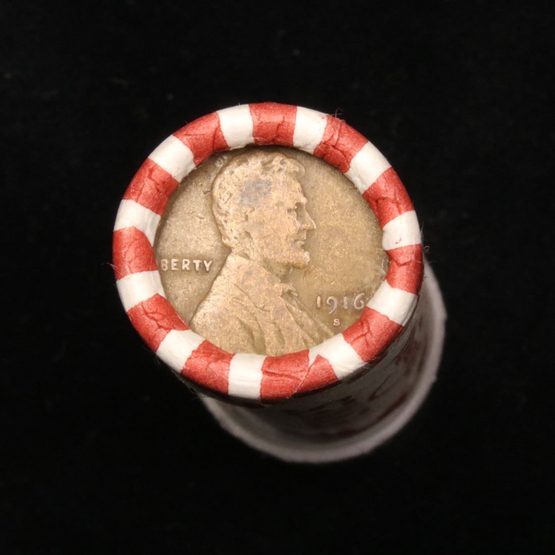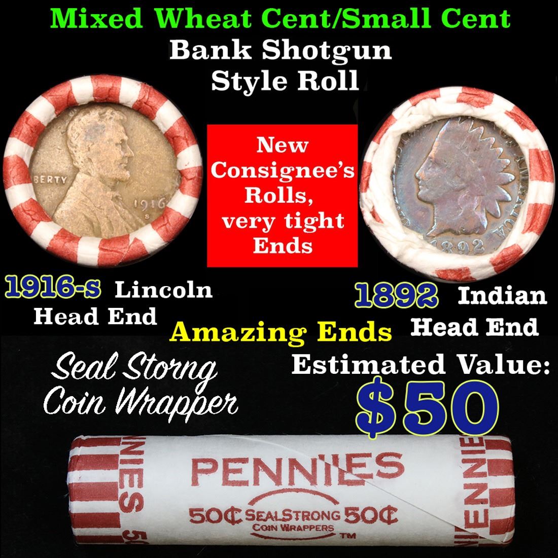 Mixed small cents 1c orig shotgun roll,1916-d Wheat Cent,1892 Indian Cent other end. The roll is held in an old Seal Strong wrapper. Actual roll pictured is the roll you will get. A great original bank shotgun roll with very tight ends. We have been getting excellent feedback on these rolls. Were being told that close to half the roll are teens, some with mintmarks, there are a few Indians in all the rolls, most of the rolls have steel cents. They seem to be PQ Wheaties rolls. These shotgun rolls are all from a new consignee. They are all frrom one Estate.