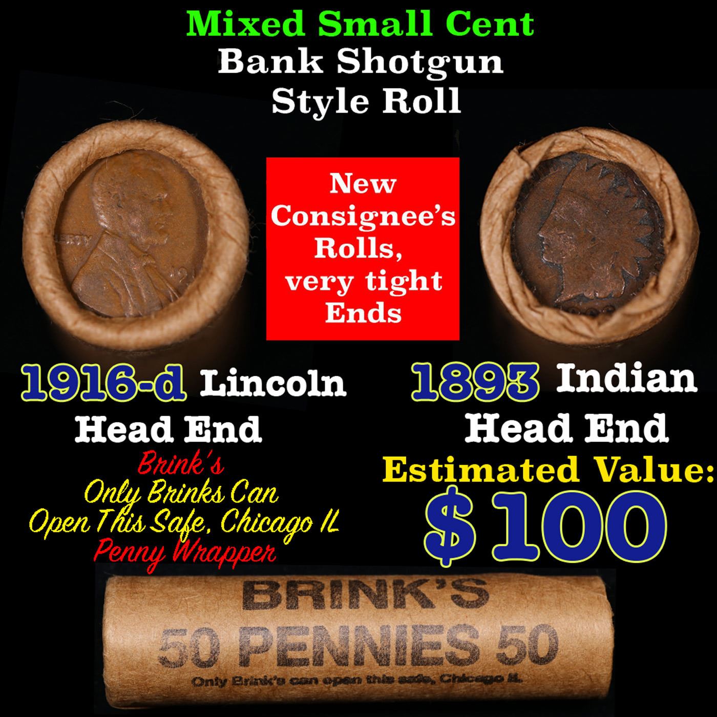 Mixed small cents 1c orig shotgun roll, 1916-d Wheat Cent, 1893 Indian Cent other end, Brinks Wrapper. The roll is held in an old Rare & Collectable Brinks Wrapper. Actual roll pictured is the roll you will get. A great original bank shotgun roll with very tight ends. We have opened a few of these rolls. They seem to be mixed small cents including Indians, Wheats, Steel cents & some Flying Eagles mixed in. These shotgun rolls are all from a new consignee. They are all frrom one Estate.