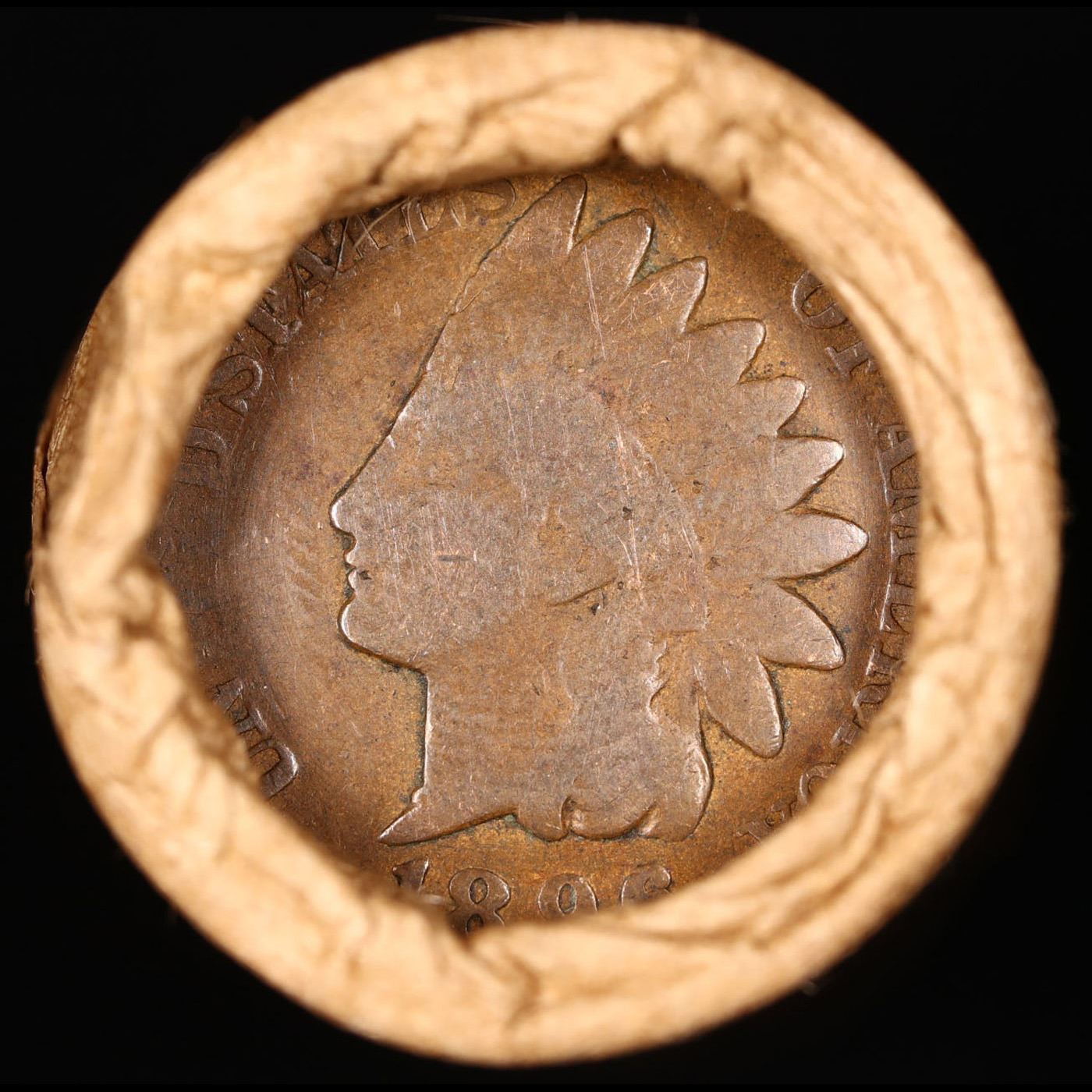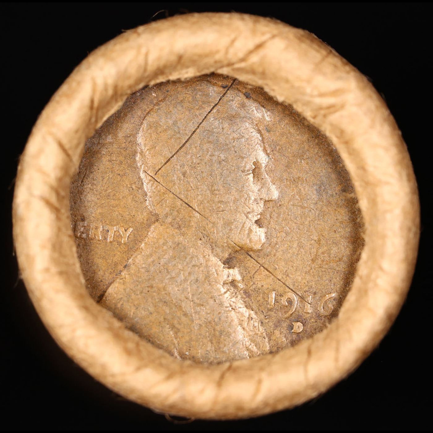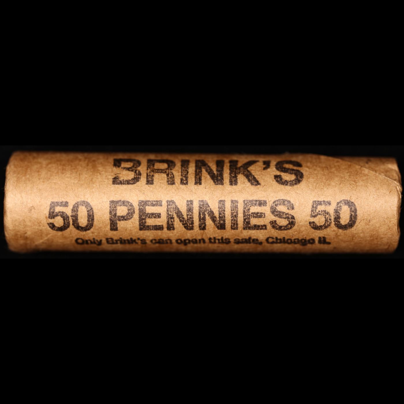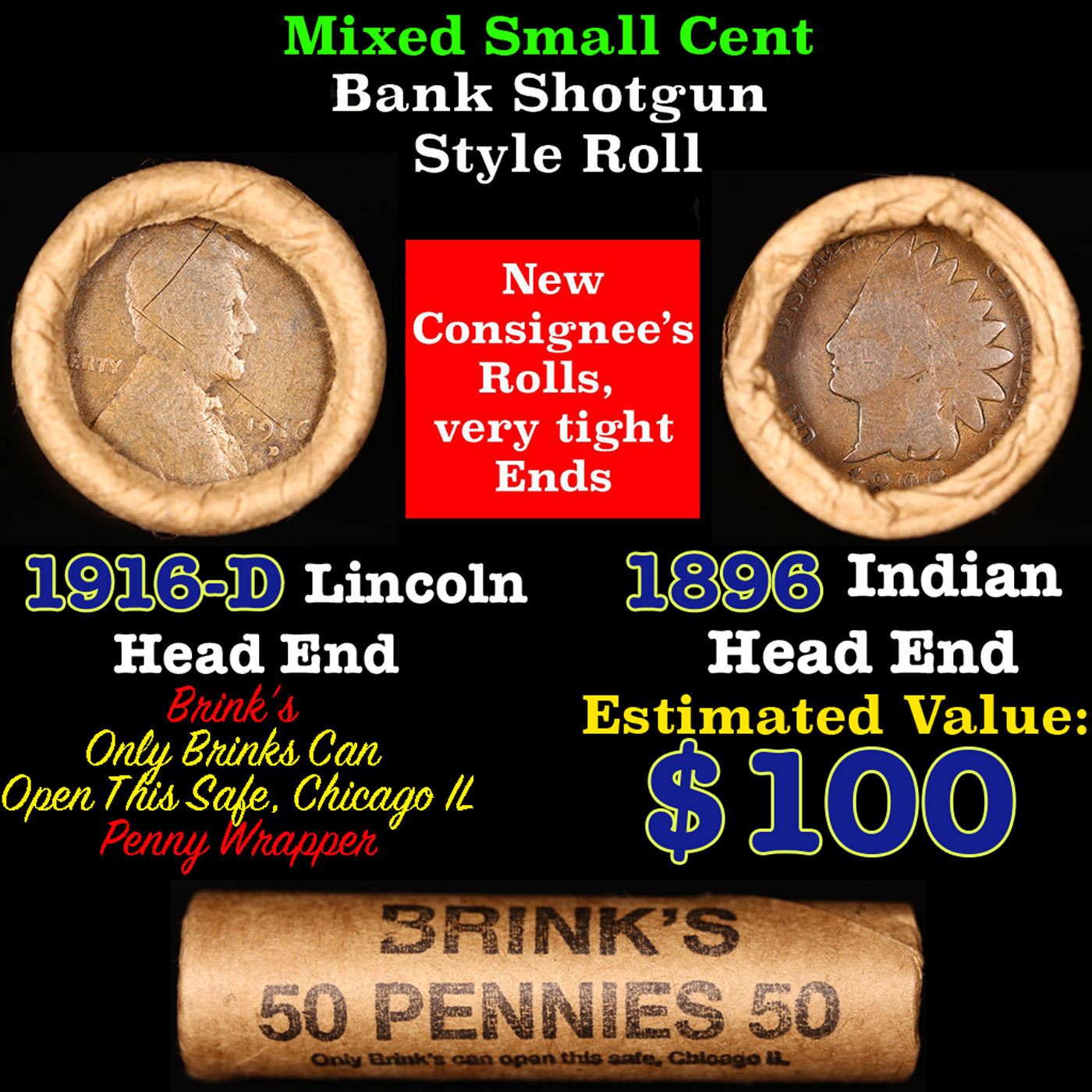 Mixed small cents 1c orig shotgun roll, 1916-d Wheat Cent, 1896 Indian Cent other end, Brinks Wrappe