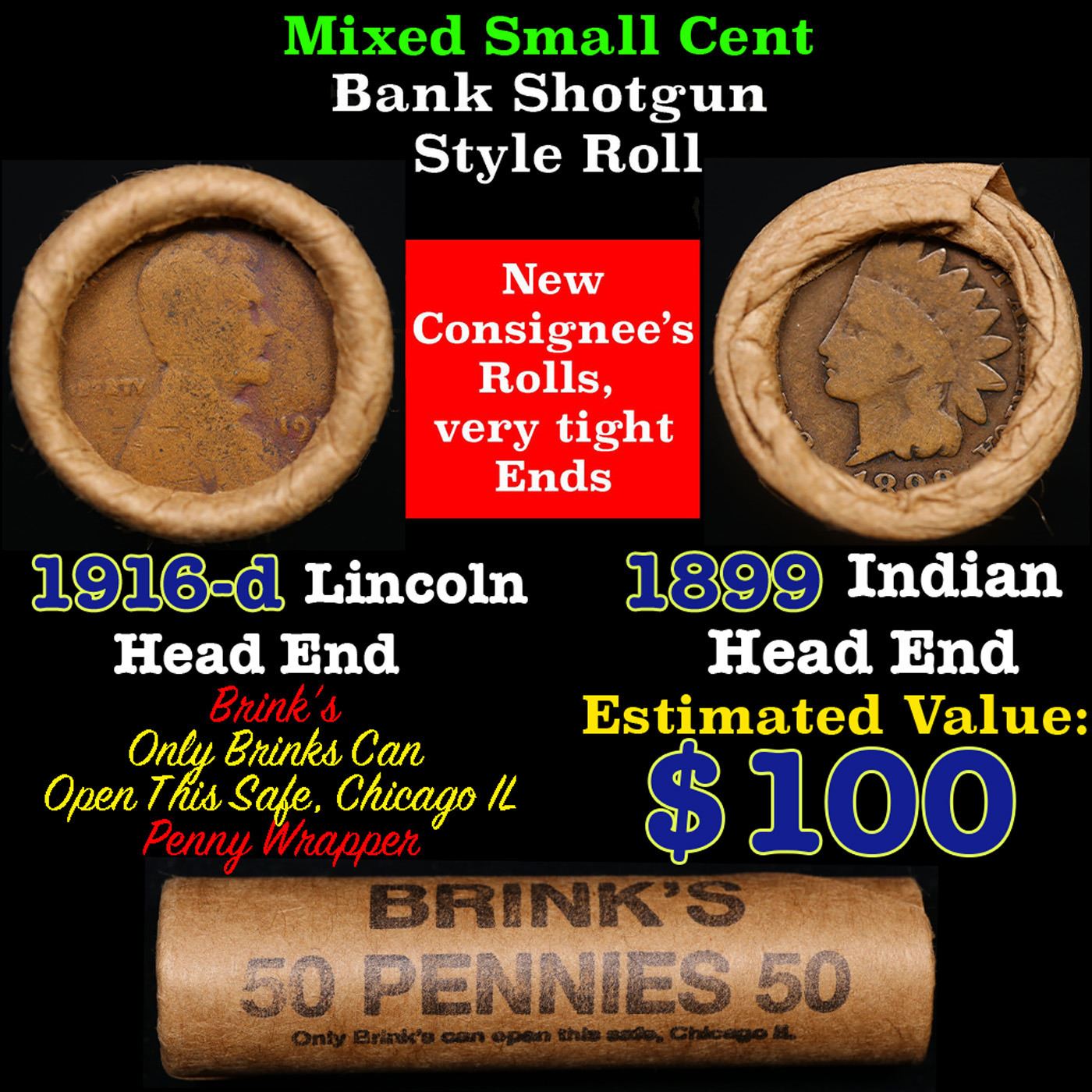 Mixed small cents 1c orig shotgun roll, 1916-d Wheat Cent, 1899 Indian Cent other end, Brinks Wrapper.. The roll is held in an old Rare & Collectable Brinks 'Only Brinks Can Open This Safe, Chicago IL' Penny wrapper. Actual roll pictured is the roll you will get. A great original bank shotgun roll with very tight ends. We have opened a few of these rolls. They seem to be mixed small cents including Indians, Wheats, Steel cents & some Flying Eagles mixed in. These shotgun rolls are all from a new consignee. They are all frrom one Estate.