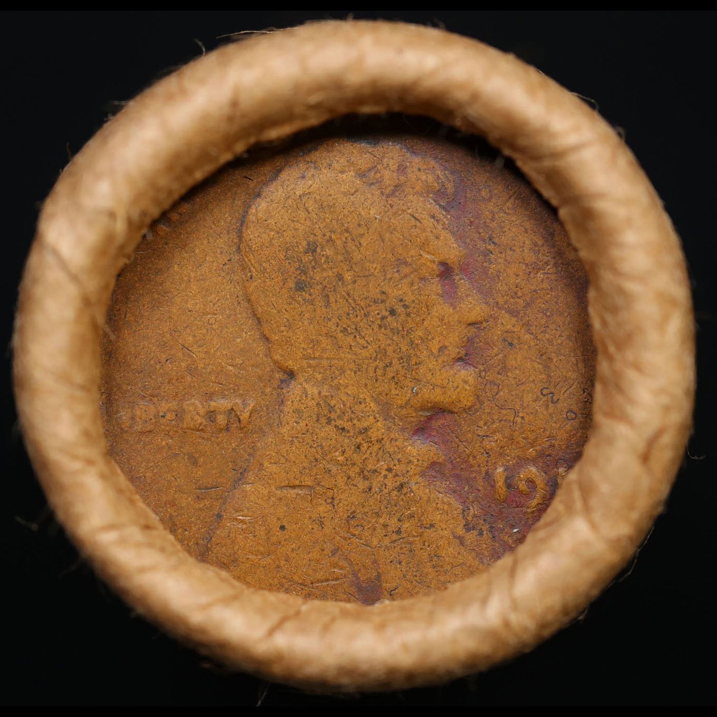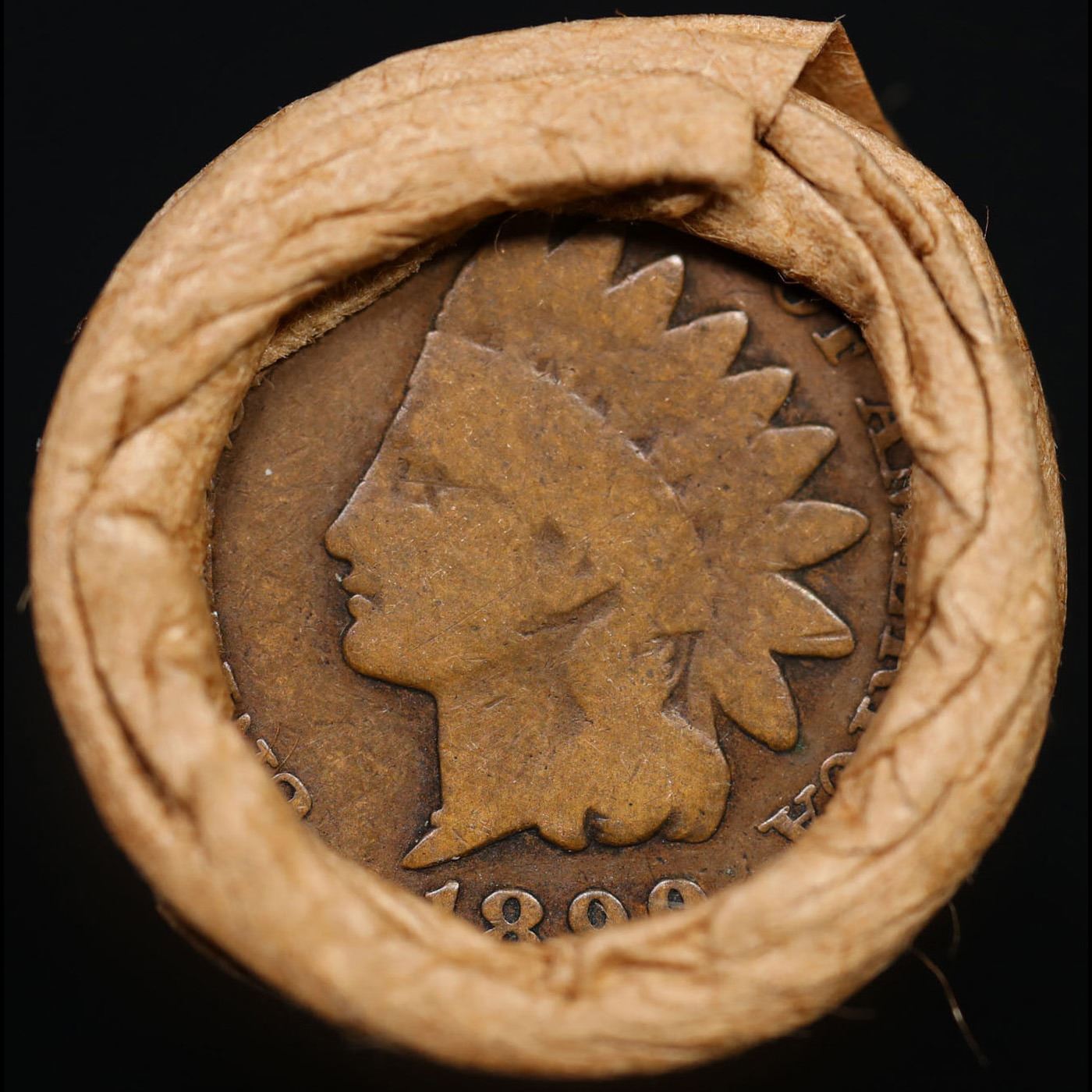 Mixed small cents 1c orig shotgun roll, 1916-d Wheat Cent, 1899 Indian Cent other end, Brinks Wrappe