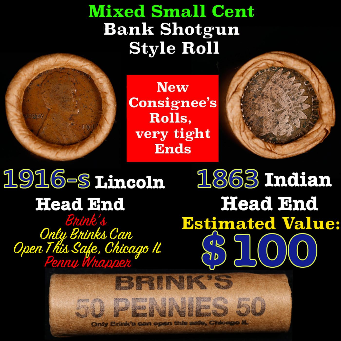 Mixed small cents 1c orig shotgun roll, 1916-s Wheat Cent, 1863 Indian Cent other end, Brinks Wrapper.. The roll is held in an old Rare & Collectable Brinks 'Only Brinks Can Open This Safe, Chicago IL' Penny wrapper. Actual roll pictured is the roll you will get. A great original bank shotgun roll with very tight ends. We have opened a few of these rolls. They seem to be mixed small cents including Indians, Wheats, Steel cents & some Flying Eagles mixed in. These shotgun rolls are all from a new consignee. They are all frrom one Estate.