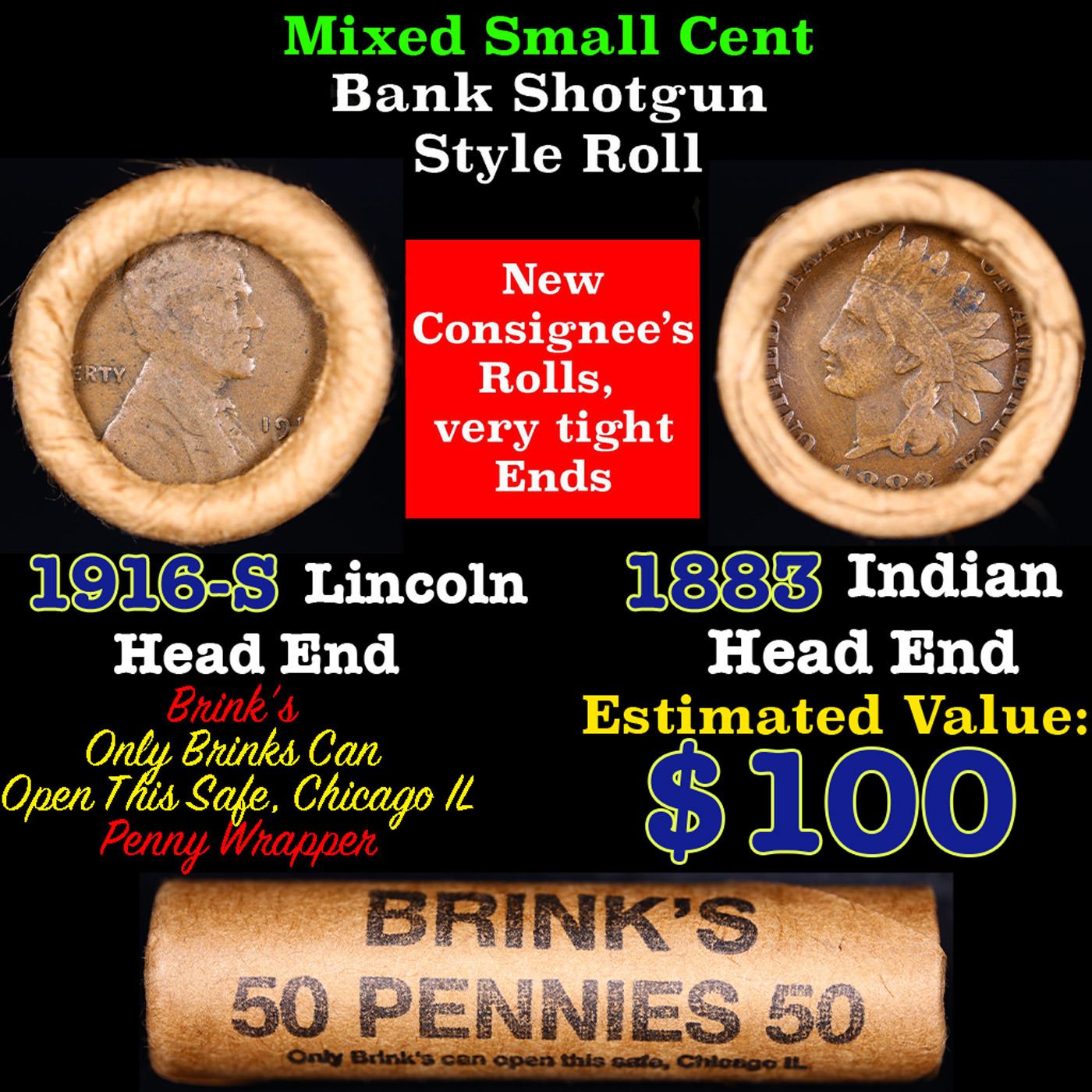 Mixed small cents 1c orig shotgun roll, 1916-s Wheat Cent, 1883 Indian Cent other end, brinks Wrapper. The roll is held in an old Rare & Collectable Brinks 'Only Brinks Can Open This Safe, Chicago IL' Penny wrapper. Actual roll pictured is the roll you will get. A great original bank shotgun roll with very tight ends. We have opened a few of these rolls. They seem to be mixed small cents including Indians, Wheats, Steel cents & some Flying Eagles mixed in. These shotgun rolls are all from a new consignee. They are all frrom one Estate.