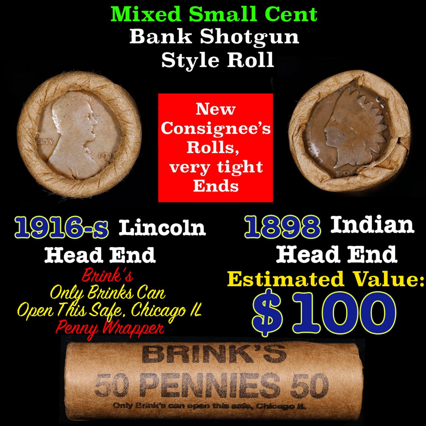 Mixed small cents 1c orig shotgun roll, 1916-s Wheat Cent, 1898 Indian Cent other end, Brinks Wrapper. The roll is held in an old Rare & Collectable Brinks Wrapper. Actual roll pictured is the roll you will get. A great original bank shotgun roll with very tight ends. We have opened a few of these rolls. They seem to be mixed small cents including Indians, Wheats, Steel cents & some Flying Eagles mixed in. These shotgun rolls are all from a new consignee. They are all frrom one Estate.