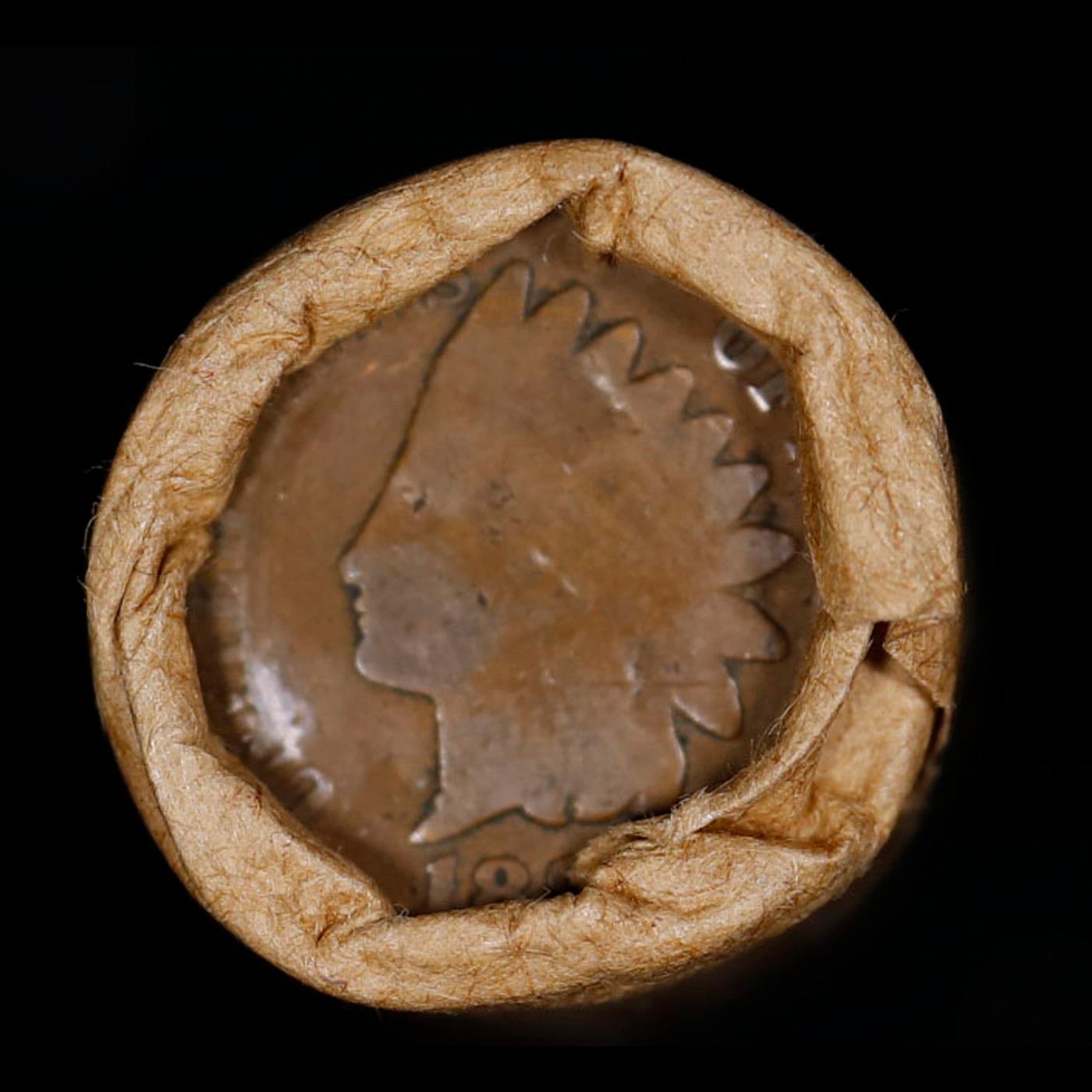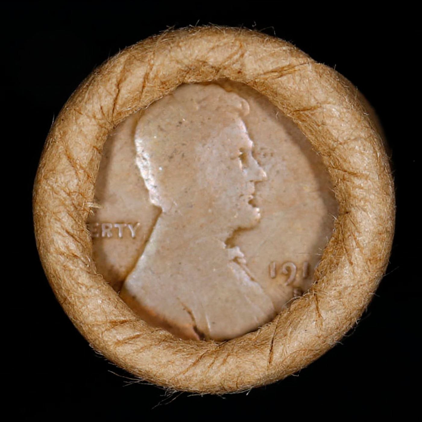 Mixed small cents 1c orig shotgun roll, 1916-s Wheat Cent, 1898 Indian Cent other end, Brinks Wrappe