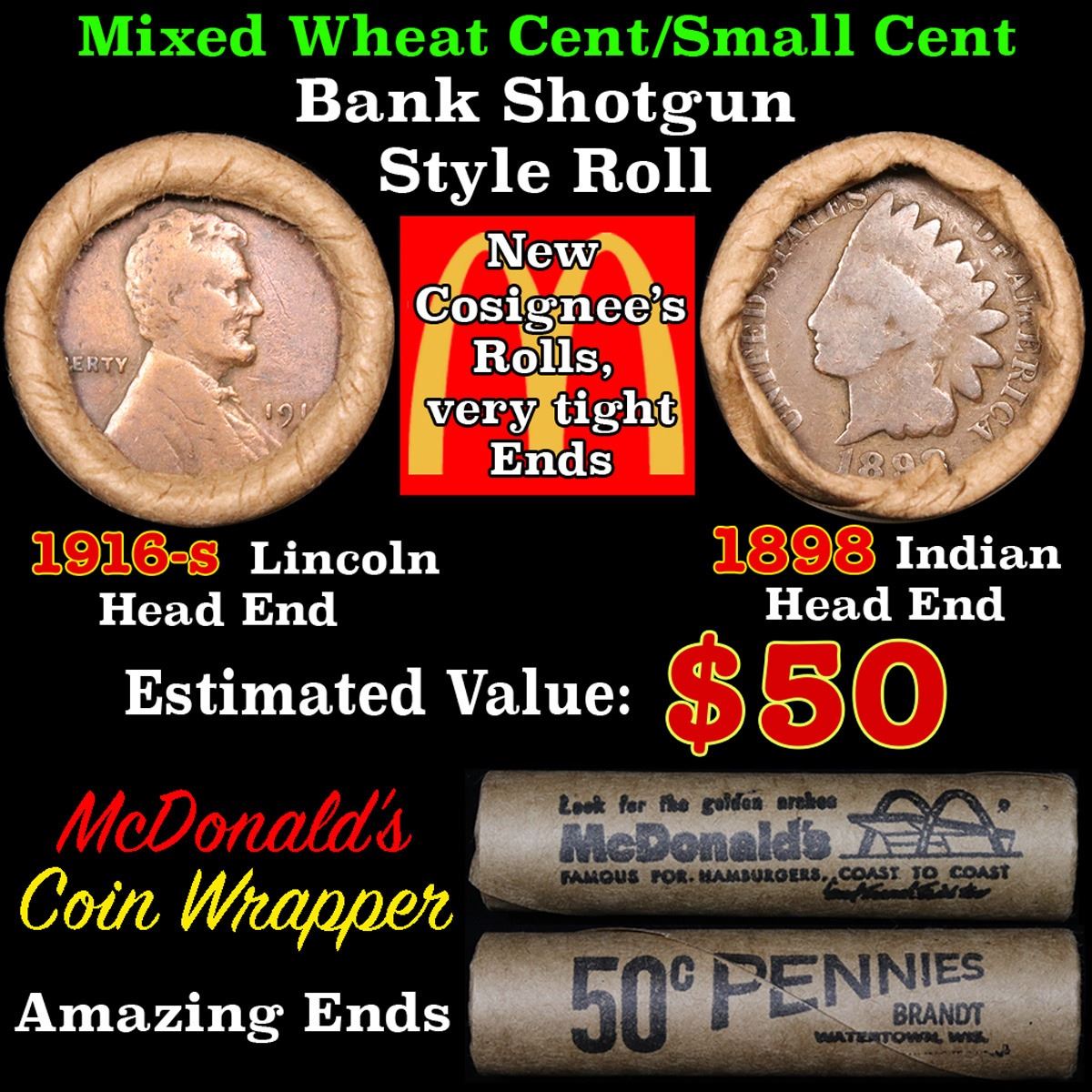 Mixed small cents 1c orig shotgun roll, 1916-s Wheat Cent, 1898 Indian Cent other end . .. The roll is held in an old Rare & Collectable McDonalds Brandt wrapper. Actual roll pictured is the roll you will get. A great original bank shotgun roll with very tight ends. We have opened a few of these rolls. They seem to be mixed small cents including Indians, Wheats, Steel cents & some Flying Eagles mixed in. These shotgun rolls are all from a new consignee. They are all frrom one Estate.