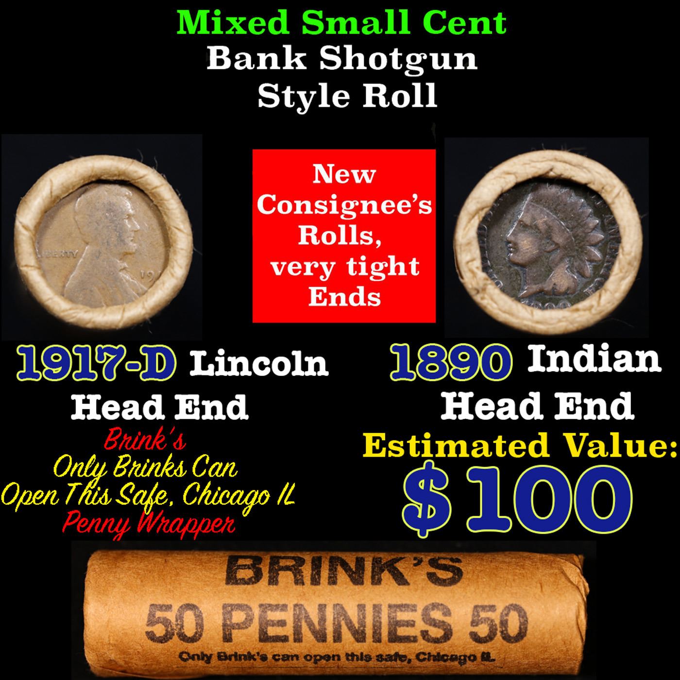 Mixed small cents 1c orig shotgun roll, 1917-D Wheat Cent, 1890 Indian Cent other end, Brinks Wrapper.. The roll is held in an old Rare & Collectable Brinks 'Only Brinks Can Open This Safe, Chicago IL' Penny wrapper. Actual roll pictured is the roll you will get. A great original bank shotgun roll with very tight ends. We have opened a few of these rolls. They seem to be mixed small cents including Indians, Wheats, Steel cents & some Flying Eagles mixed in. These shotgun rolls are all from a new consignee. They are all frrom one Estate.