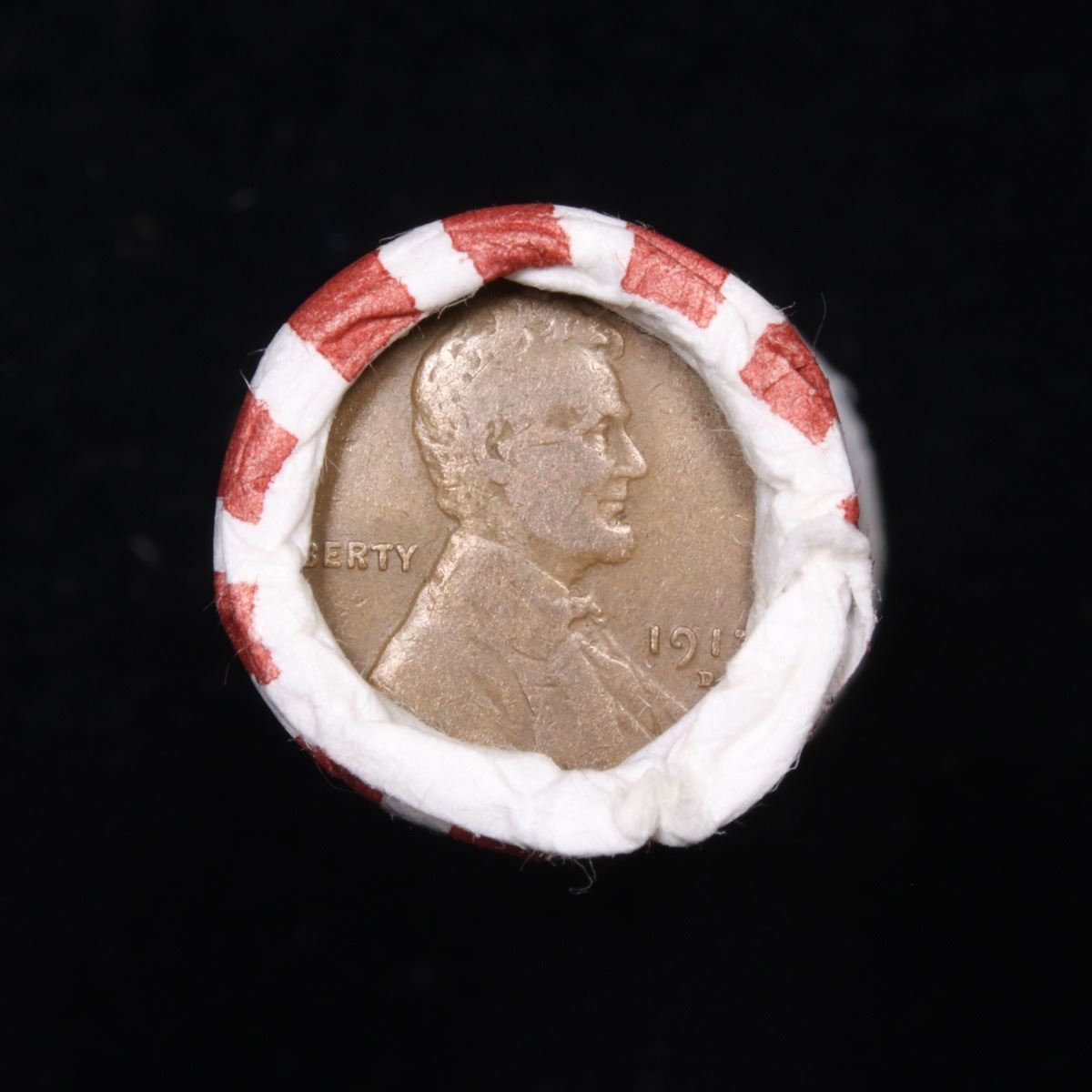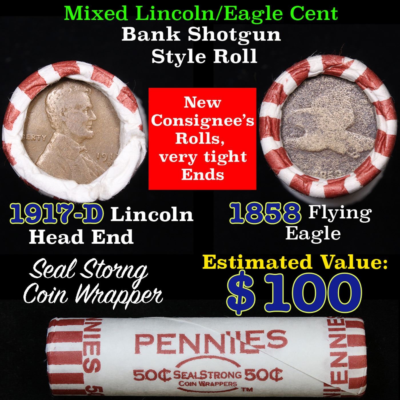Mixed small cents 1c orig shotgun roll, 1917-d Wheat Cent, 1858 Indian Cent other end, N.F. String &