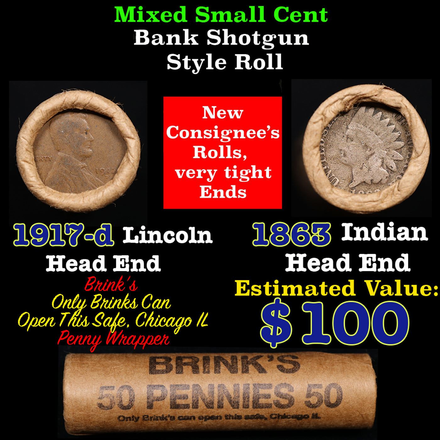 Mixed small cents 1c orig shotgun roll, 1917-d Wheat Cent, 1863 Indian Cent other end, Brinks Wrapper.. The roll is held in an old Rare & Collectable Brinks 'Only Brinks Can Open This Safe, Chicago IL' Penny wrapper. Actual roll pictured is the roll you will get. A great original bank shotgun roll with very tight ends. We have opened a few of these rolls. They seem to be mixed small cents including Indians, Wheats, Steel cents & some Flying Eagles mixed in. These shotgun rolls are all from a new consignee. They are all frrom one Estate.