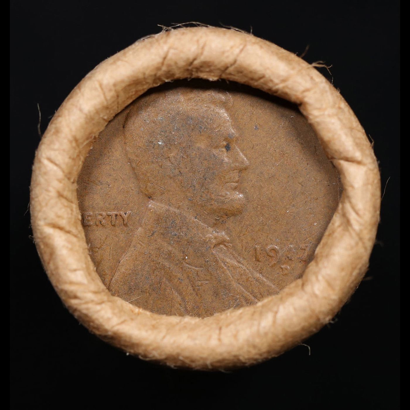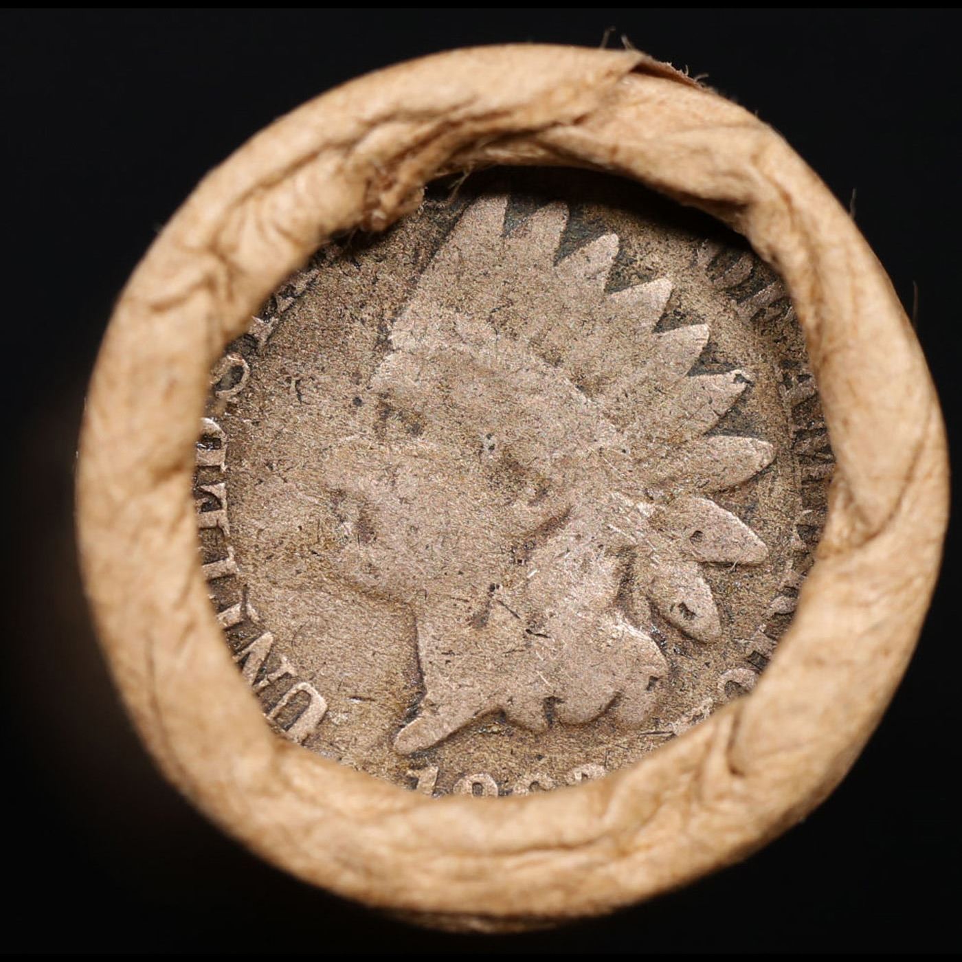 Mixed small cents 1c orig shotgun roll, 1917-d Wheat Cent, 1863 Indian Cent other end, Brinks Wrappe