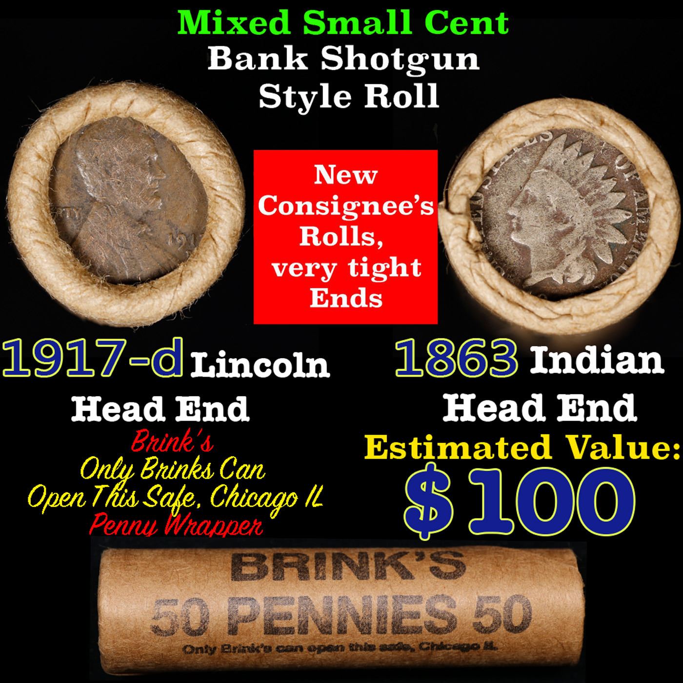 Mixed small cents 1c orig shotgun roll, 1917-d Wheat Cent, 1863 Indian Cent other end, Brinks Wrapper.. The roll is held in an old Rare & Collectable Brinks 'Only Brinks Can Open This Safe, Chicago IL' Penny wrapper. Actual roll pictured is the roll you will get. A great original bank shotgun roll with very tight ends. We have opened a few of these rolls. They seem to be mixed small cents including Indians, Wheats, Steel cents & some Flying Eagles mixed in. These shotgun rolls are all from a new consignee. They are all frrom one Estate.