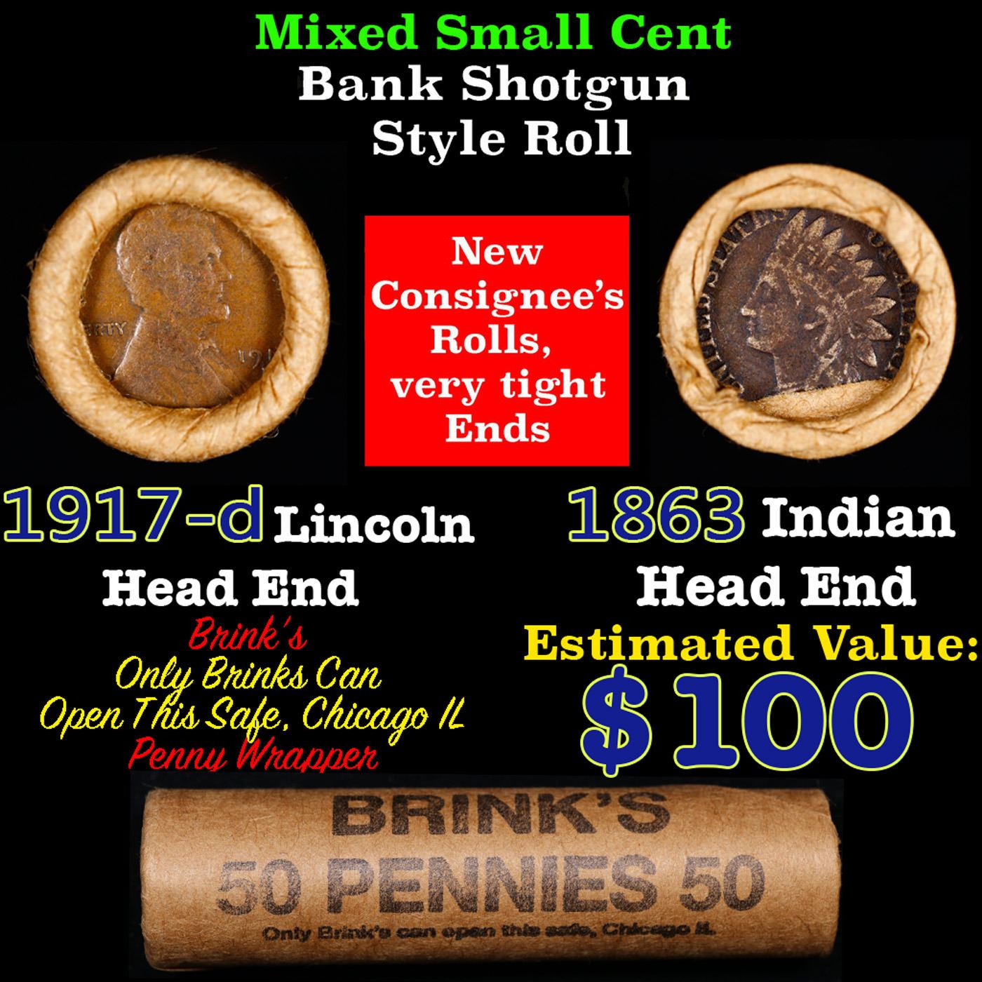 Mixed small cents 1c orig shotgun roll, 1917-d Wheat Cent, 1863 Indian Cent other end, Brinks Wrapper.. The roll is held in an old Rare & Collectable Brinks 'Only Brinks Can Open This Safe, Chicago IL' Penny wrapper. Actual roll pictured is the roll you will get. A great original bank shotgun roll with very tight ends. We have opened a few of these rolls. They seem to be mixed small cents including Indians, Wheats, Steel cents & some Flying Eagles mixed in. These shotgun rolls are all from a new consignee. They are all frrom one Estate.