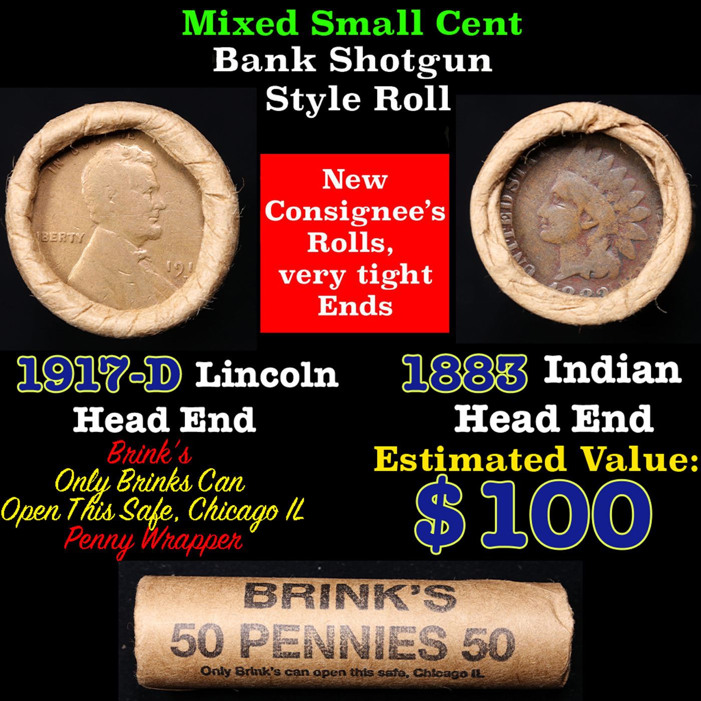 Mixed small cents 1c orig shotgun roll, 1917-d Wheat Cent, 1883 Indian Cent other end, Brinks Wrapper. The roll is held in an old Rare & Collectable Brinks Wrapper. Actual roll pictured is the roll you will get. A great original bank shotgun roll with very tight ends. We have opened a few of these rolls. They seem to be mixed small cents including Indians, Wheats, Steel cents & some Flying Eagles mixed in. These shotgun rolls are all from a new consignee. They are all frrom one Estate.