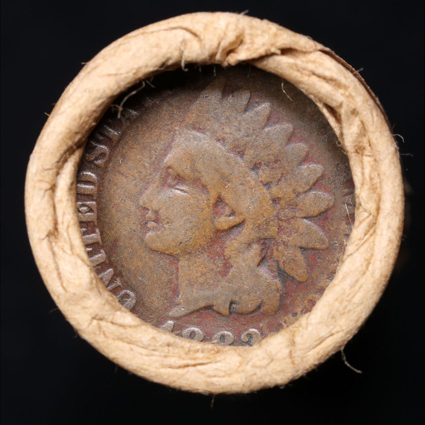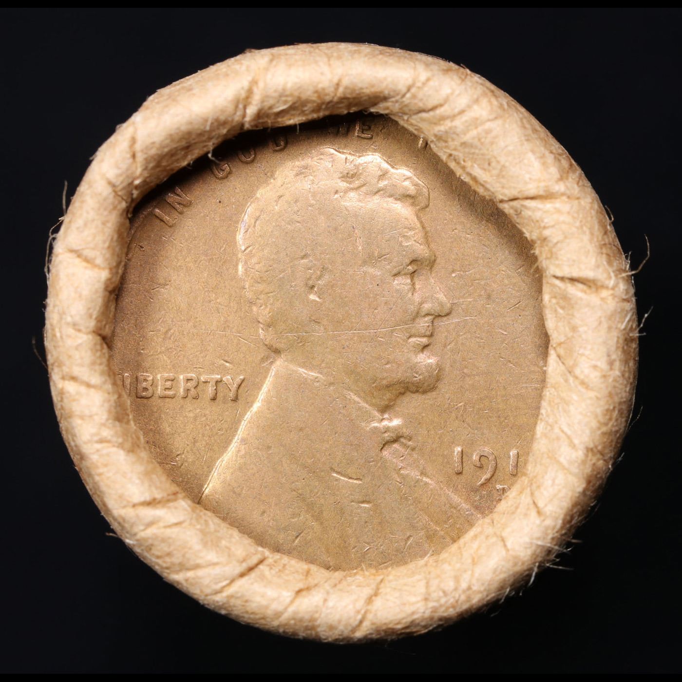 Mixed small cents 1c orig shotgun roll, 1917-d Wheat Cent, 1883 Indian Cent other end, Brinks Wrappe