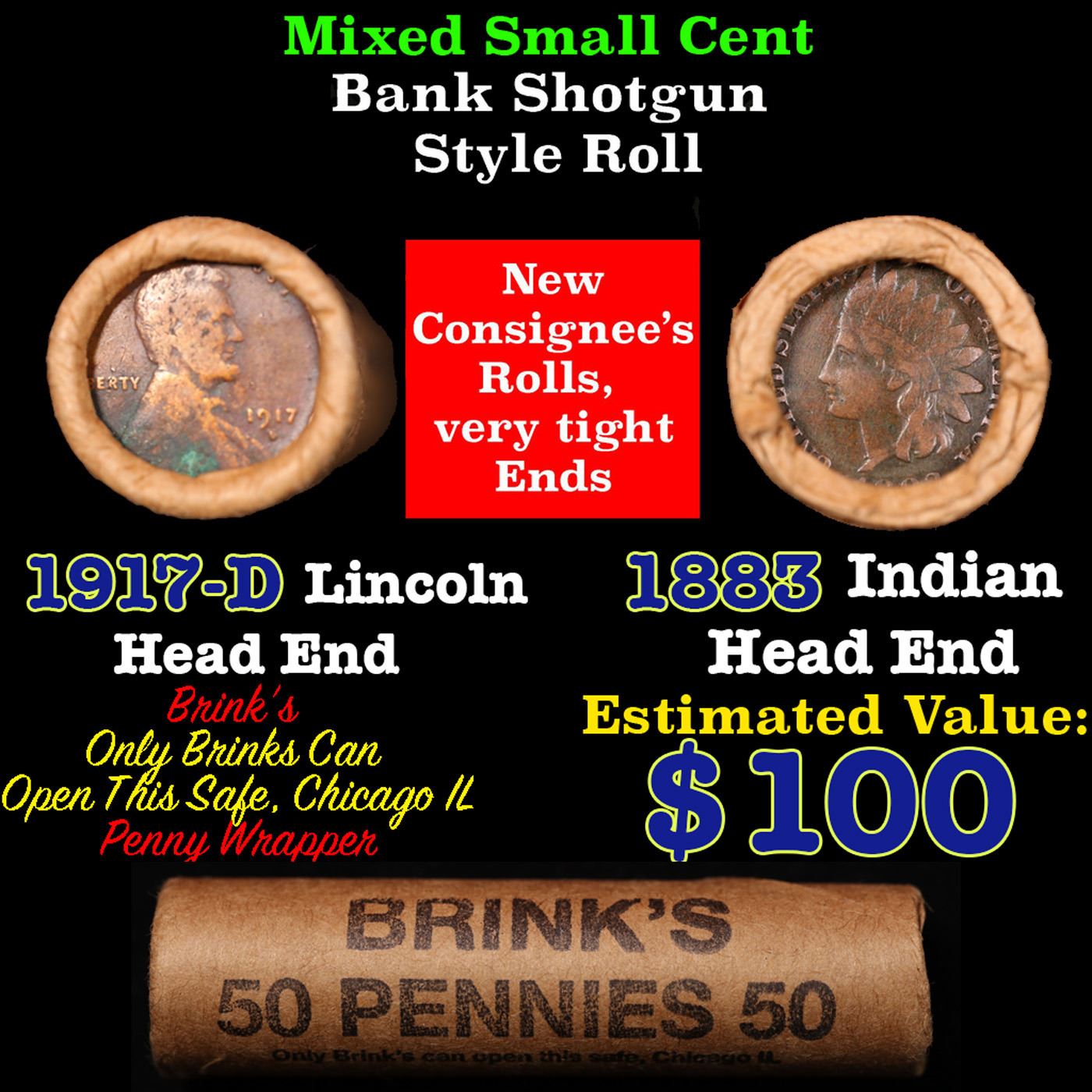 Mixed small cents 1c orig shotgun roll, 1917-d Wheat Cent, 1883 Indian Cent other end, Brinks Wrapper. The roll is held in an old Rare & Collectable Brinks Wrapper. Actual roll pictured is the roll you will get. A great original bank shotgun roll with very tight ends. We have opened a few of these rolls. They seem to be mixed small cents including Indians, Wheats, Steel cents & some Flying Eagles mixed in. These shotgun rolls are all from a new consignee. They are all frrom one Estate.
