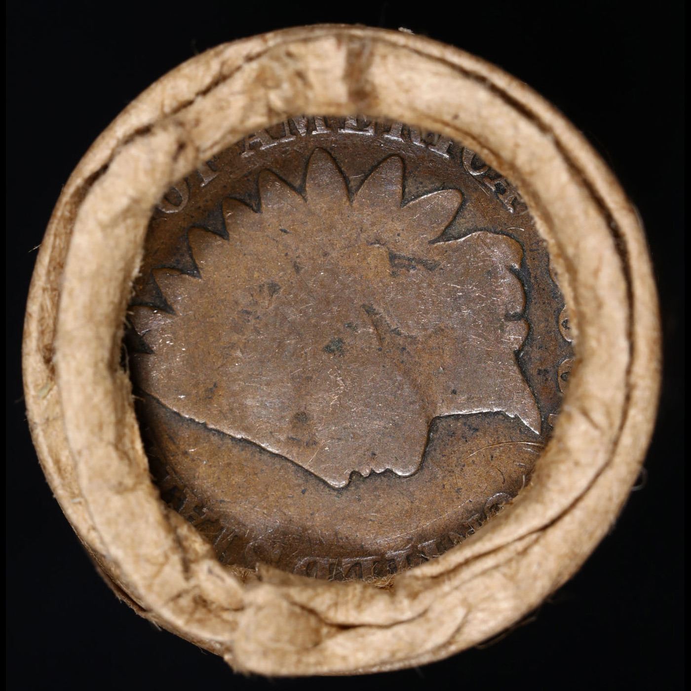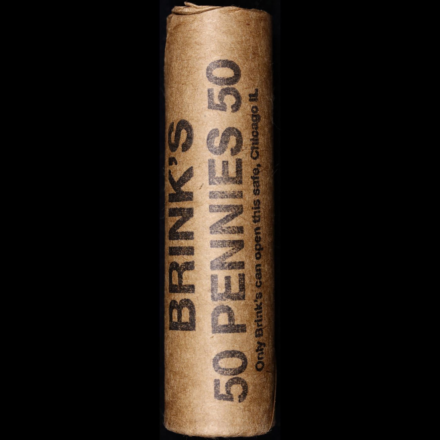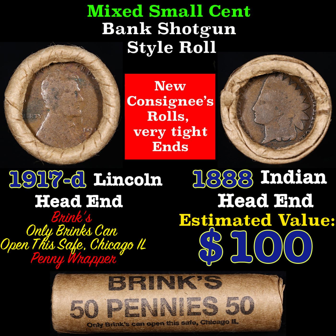 Mixed small cents 1c orig shotgun roll, 1917-d Wheat Cent, 1888 Indian Cent other end, Brinks Wrappe