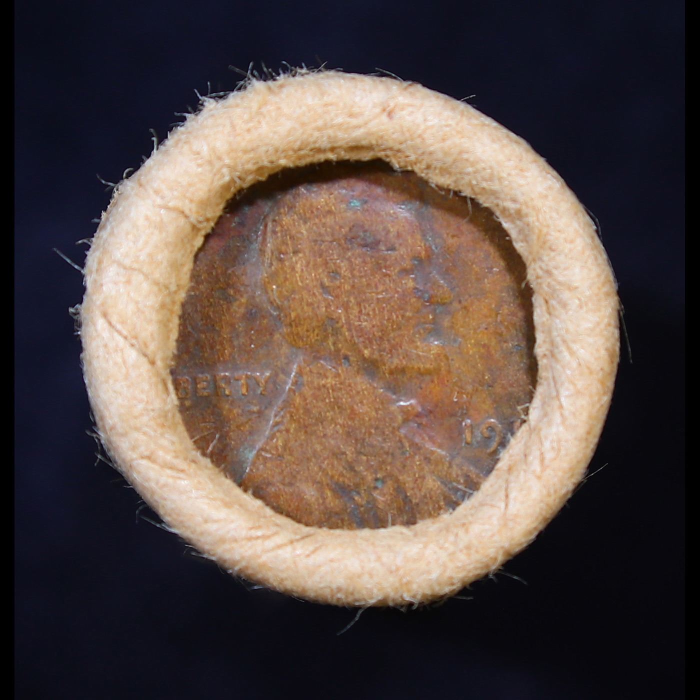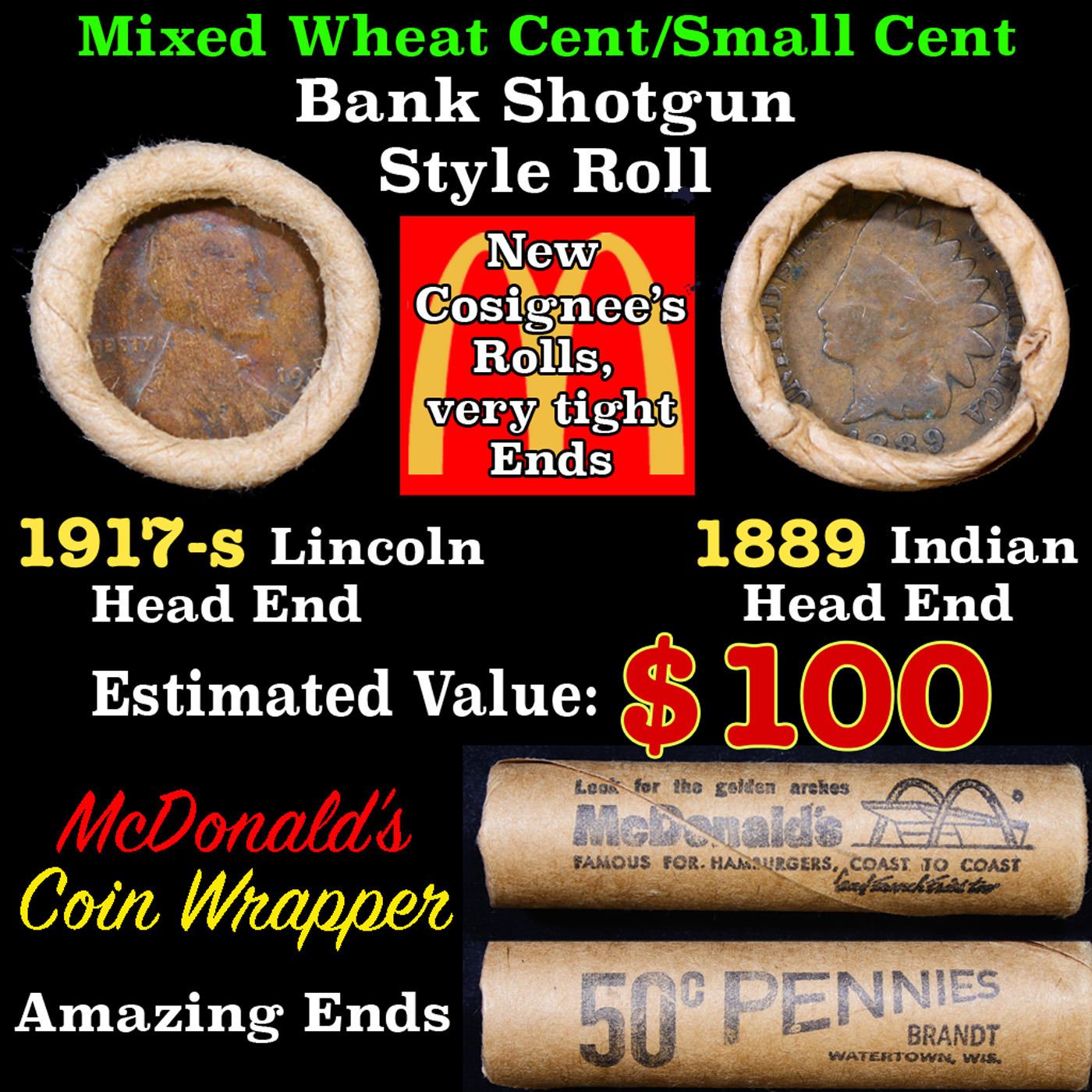 Mixed small cents 1c orig shotgun roll, 1917-d Wheat Cent, 1889 Indian Cent other end, Brandt Wrappe