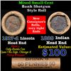 Mixed small cents 1c orig shotgun roll, 1917-d Wheat Cent, 1889 Indian Cent other end, Brinks Wrappe