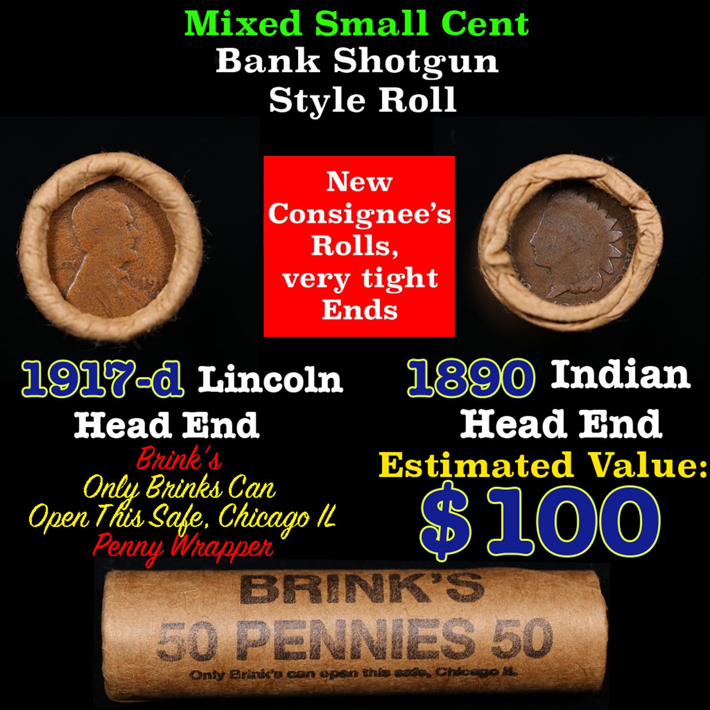 Mixed small cents 1c orig shotgun roll, 1917-d Wheat Cent, 1890 Indian Cent other end, Brinks Wrapper.. The roll is held in an old Rare & Collectable Brinks 'Only Brinks Can Open This Safe, Chicago IL' Penny wrapper. Actual roll pictured is the roll you will get. A great original bank shotgun roll with very tight ends. We have opened a few of these rolls. They seem to be mixed small cents including Indians, Wheats, Steel cents & some Flying Eagles mixed in. These shotgun rolls are all from a new consignee. They are all frrom one Estate.