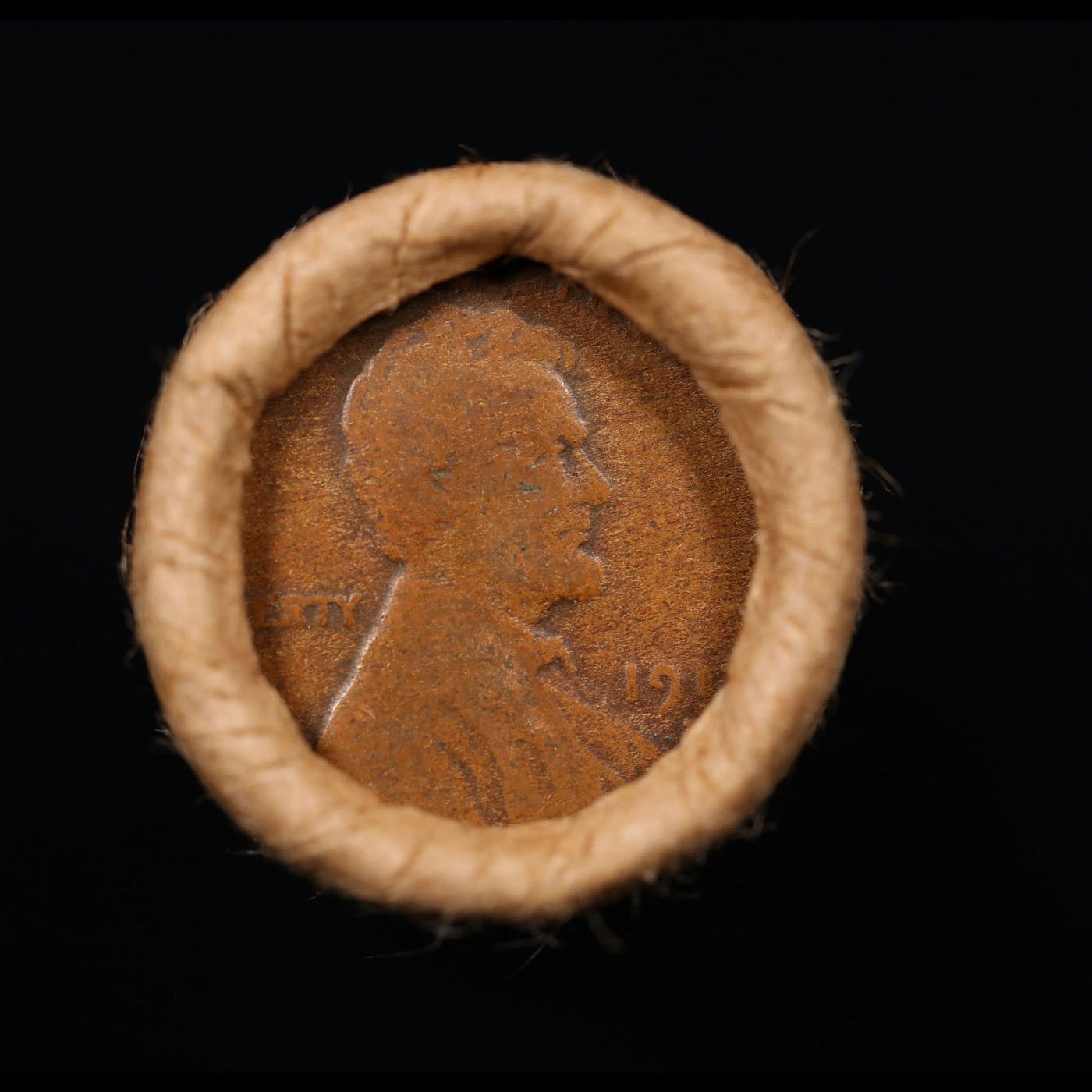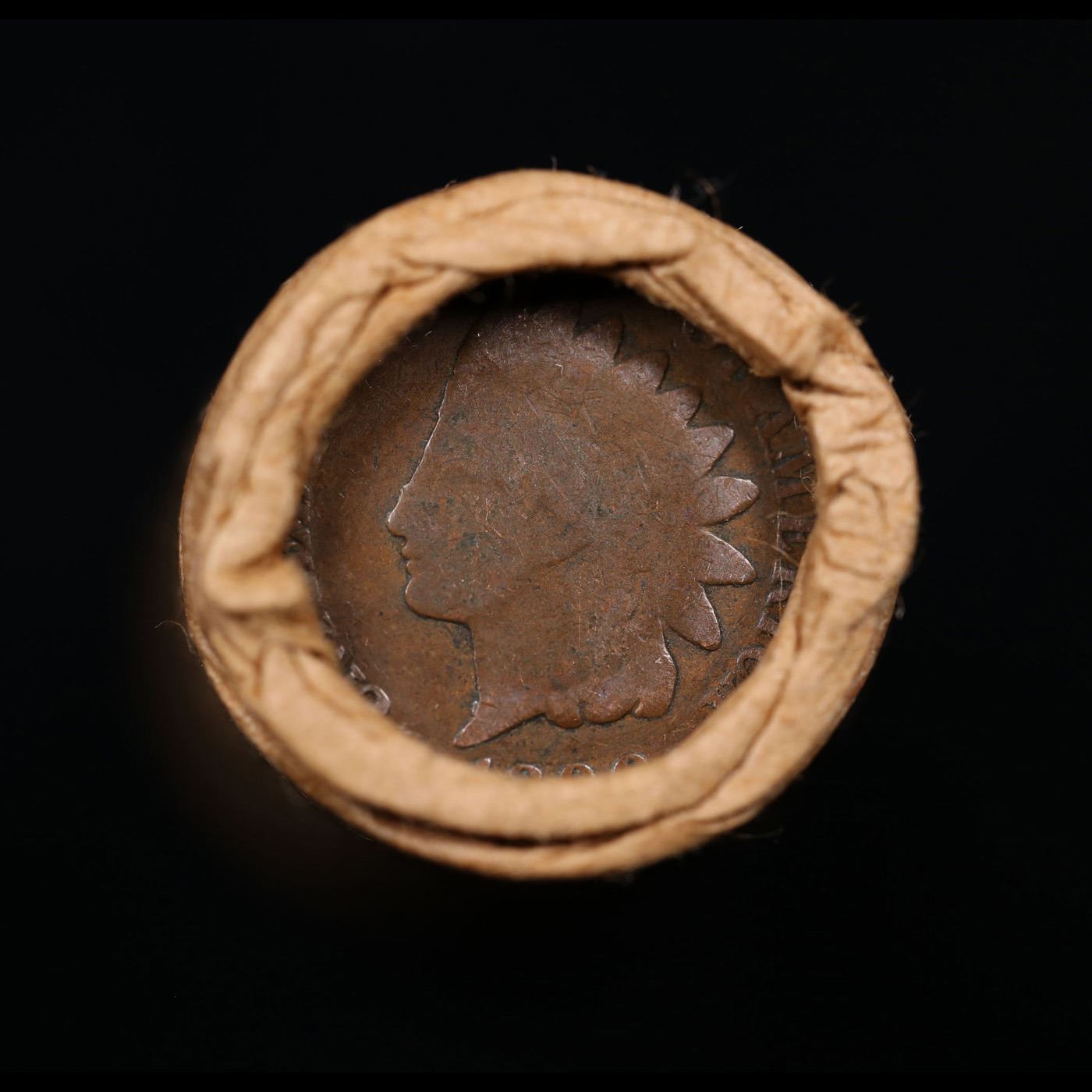 Mixed small cents 1c orig shotgun roll, 1917-d Wheat Cent, 1890 Indian Cent other end, Brinks Wrappe