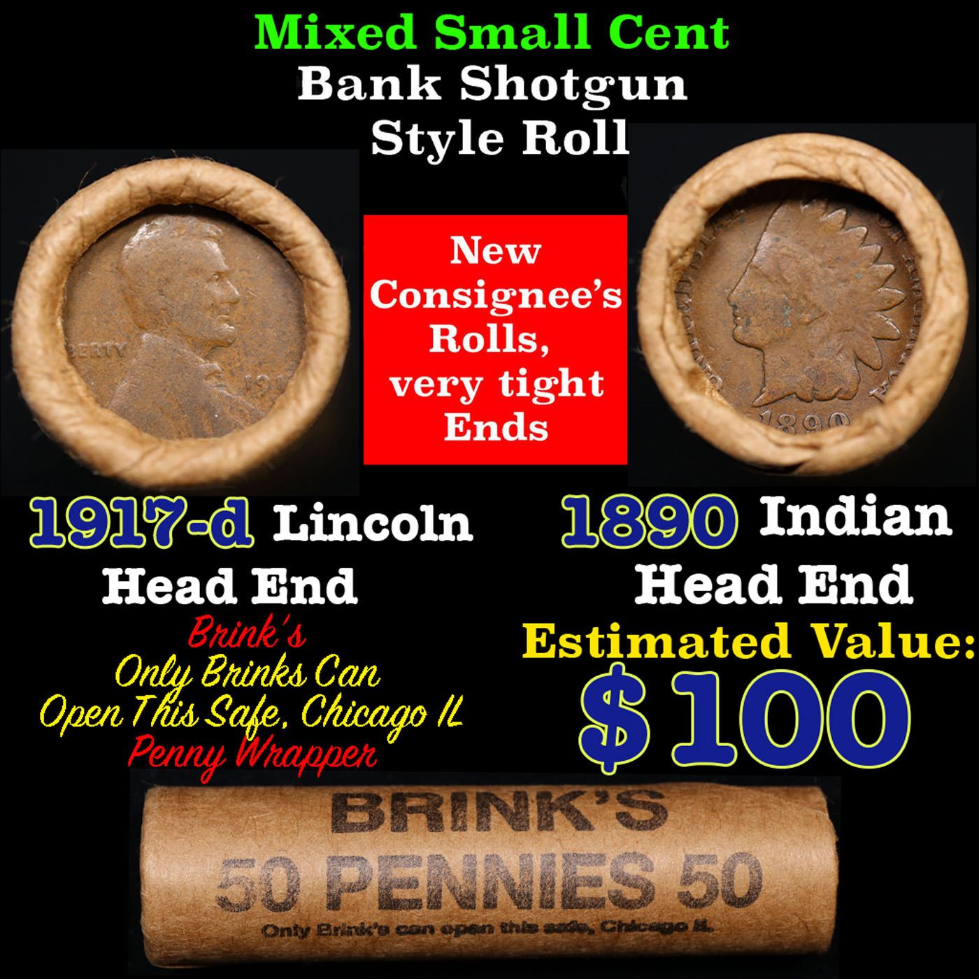 Mixed small cents 1c orig shotgun roll, 1917-d Wheat Cent, 1890 Indian Cent other end, Brinks Wrapper.. The roll is held in an old Rare & Collectable Brinks 'Only Brinks Can Open This Safe, Chicago IL' Penny wrapper. Actual roll pictured is the roll you will get. A great original bank shotgun roll with very tight ends. We have opened a few of these rolls. They seem to be mixed small cents including Indians, Wheats, Steel cents & some Flying Eagles mixed in. These shotgun rolls are all from a new consignee. They are all frrom one Estate.