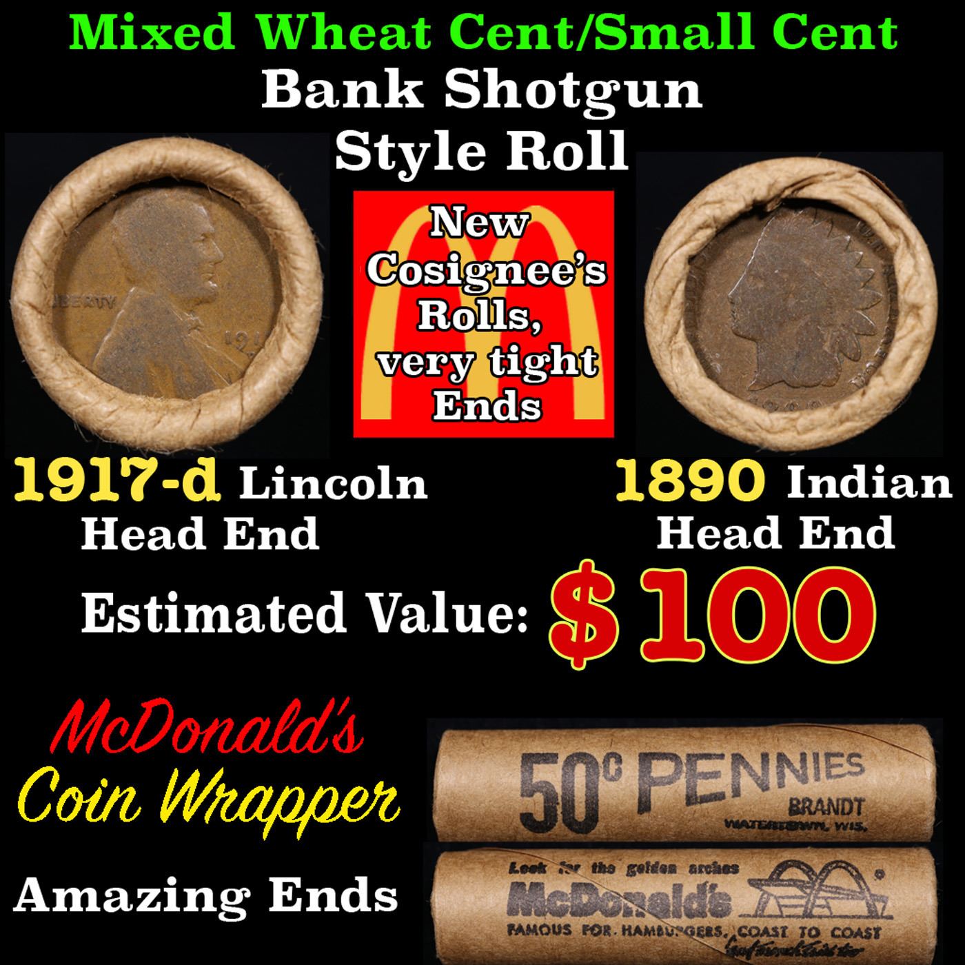 Mixed small cents 1c orig shotgun roll, 1917-d Wheat Cent, 1890 Indian Cent other end, McDonalds Wra
