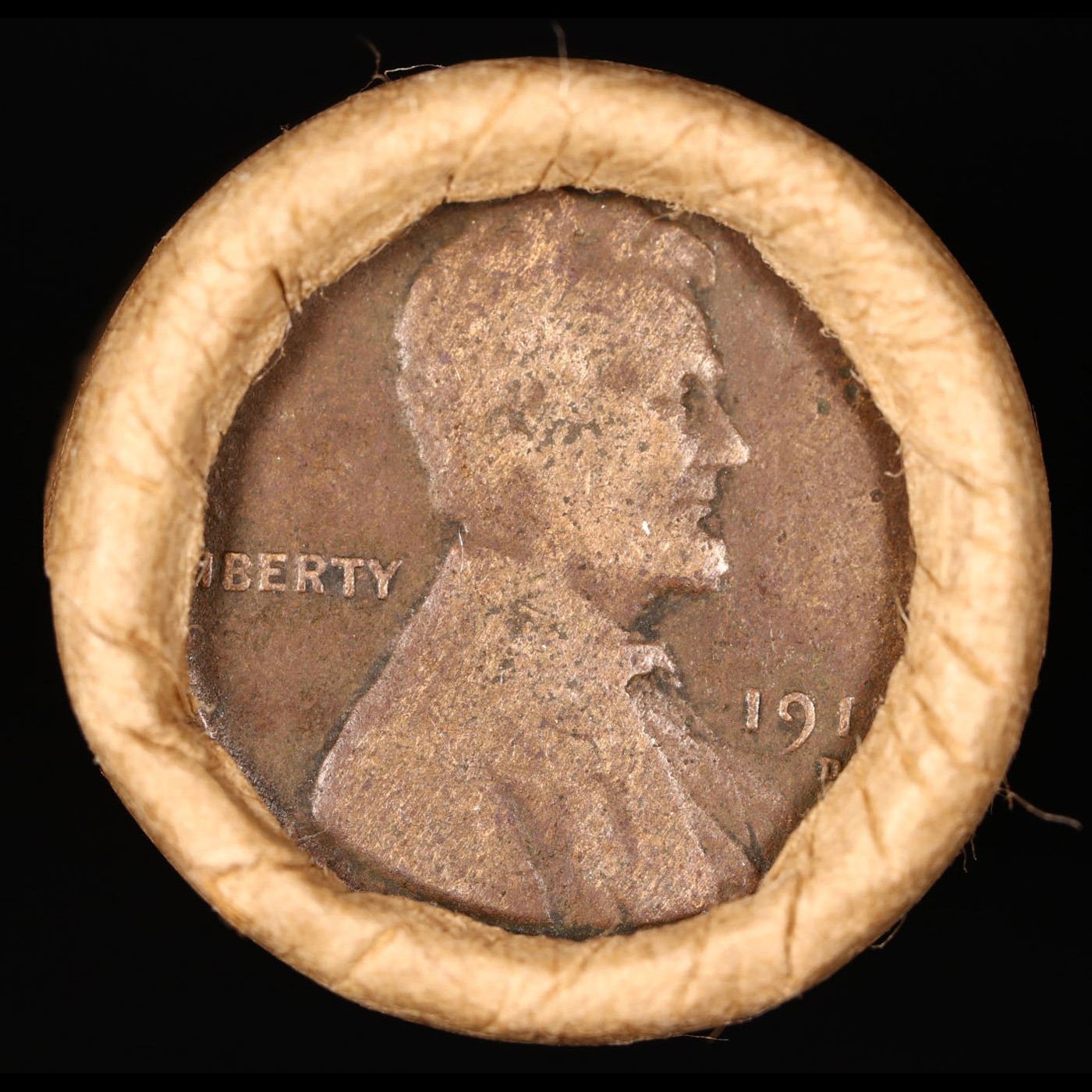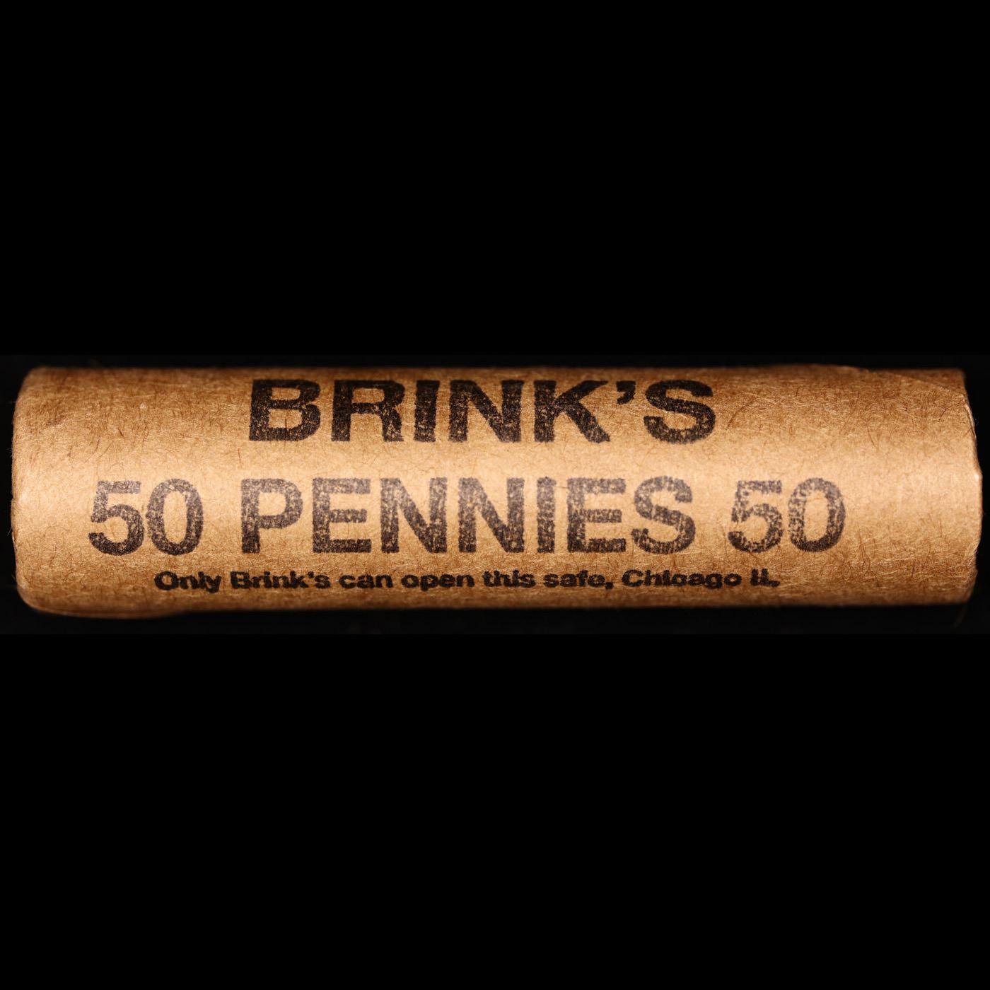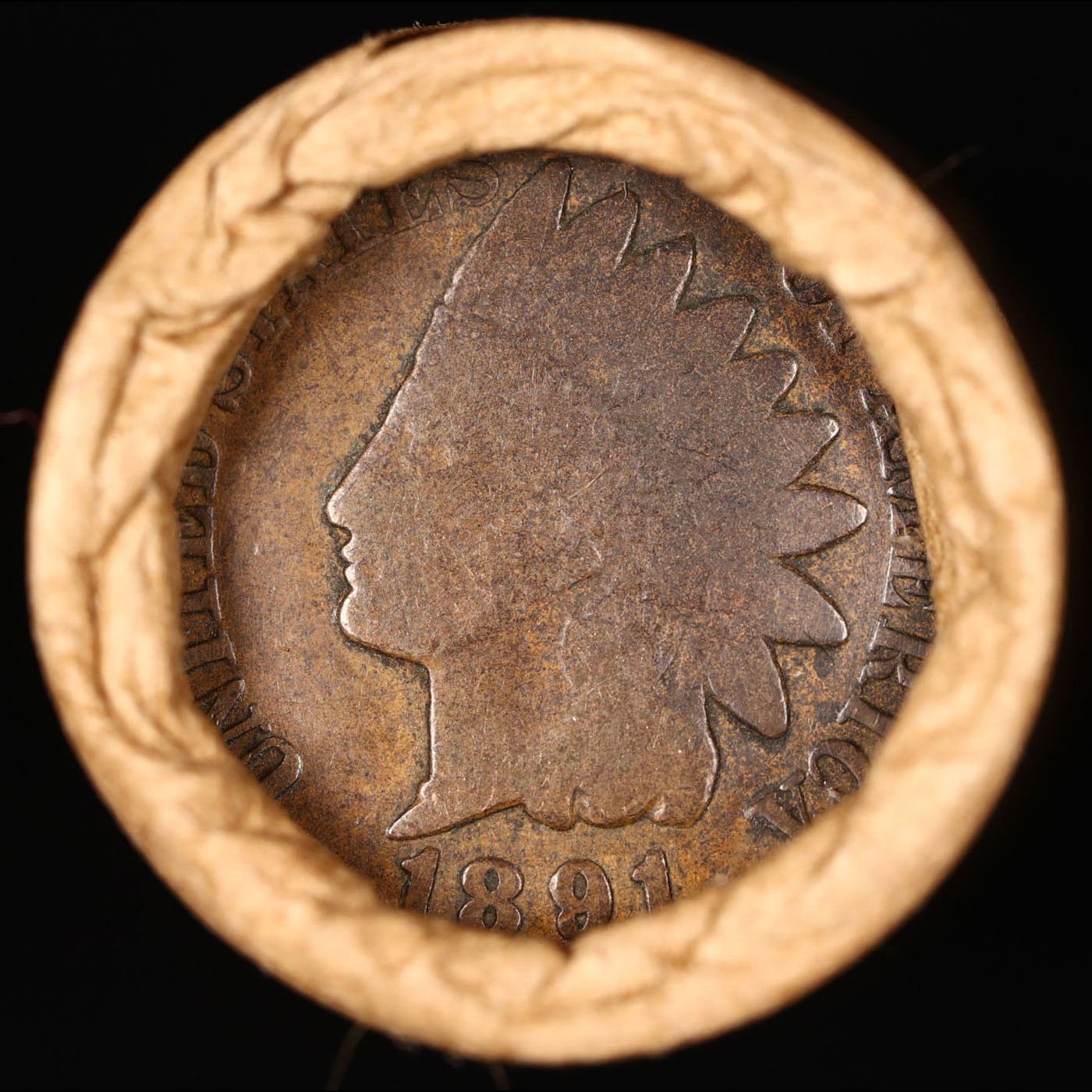 Mixed small cents 1c orig shotgun roll, 1917-d Wheat Cent, 1891 Indian Cent other end, Brinks Wrappe