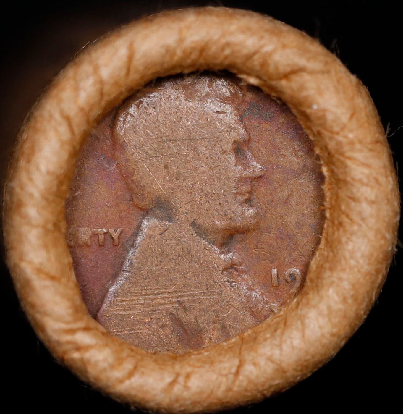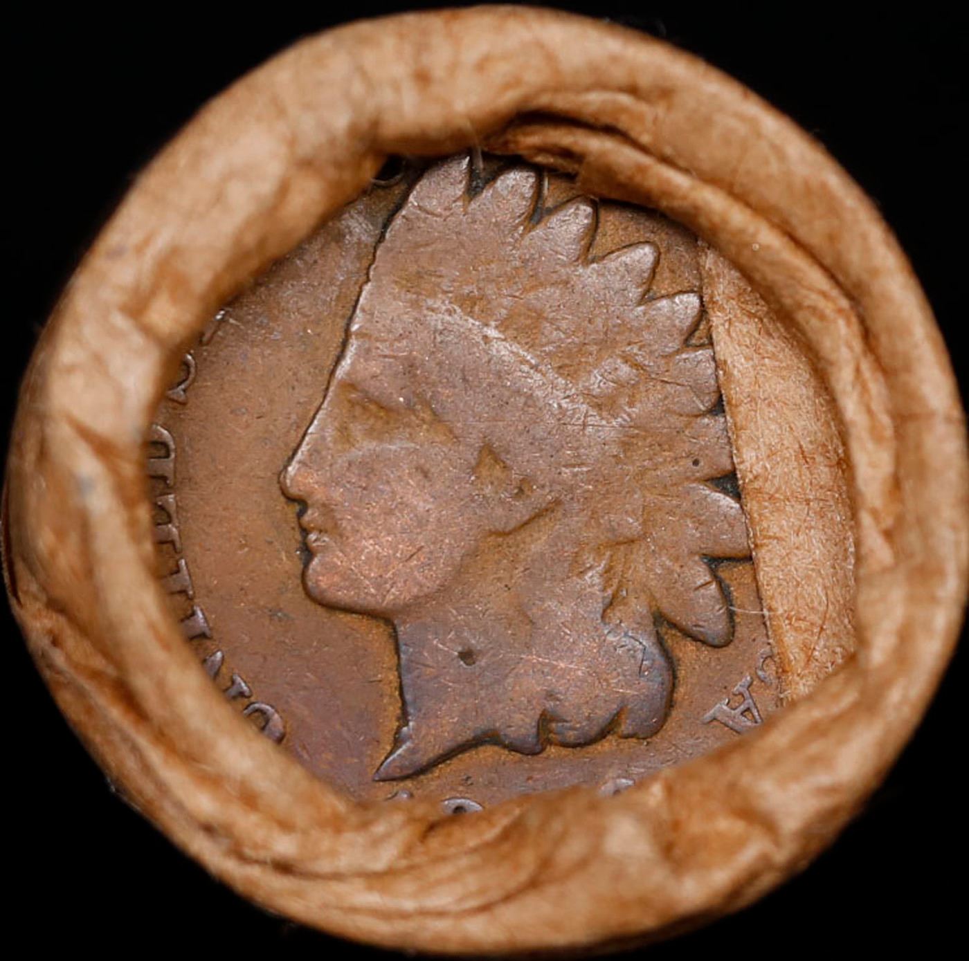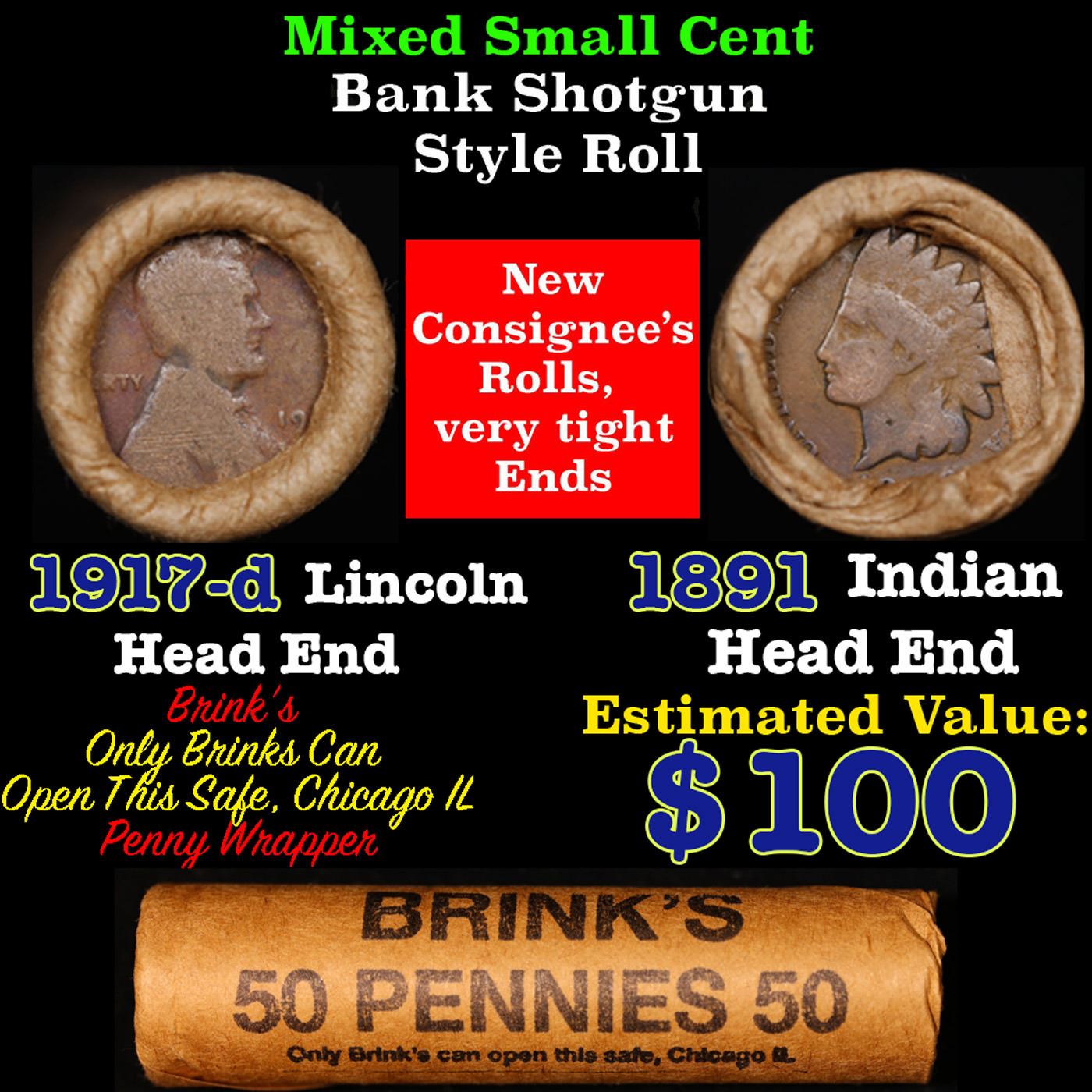 Mixed small cents 1c orig shotgun roll, 1917-d Wheat Cent, 1891 Indian Cent other end, Brinks Wrappe