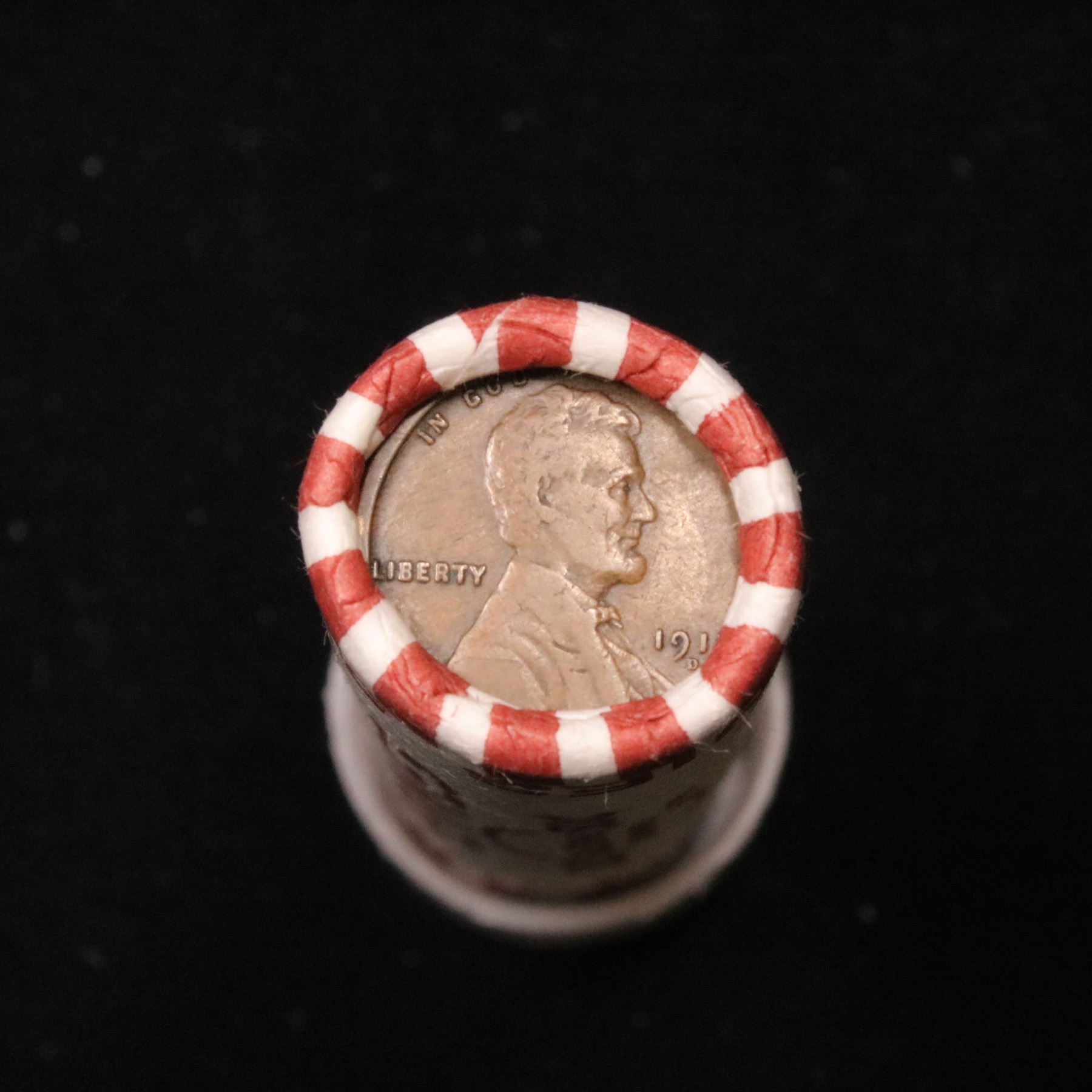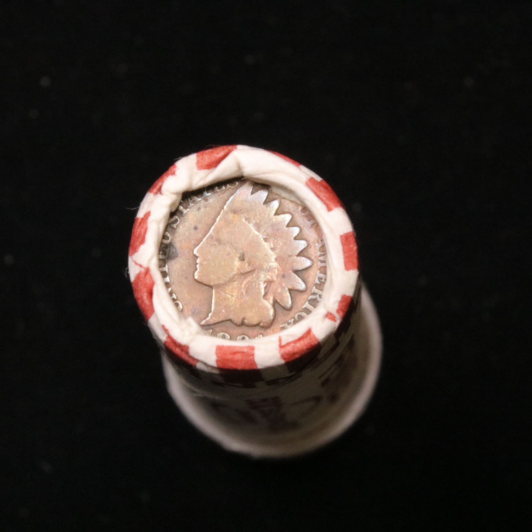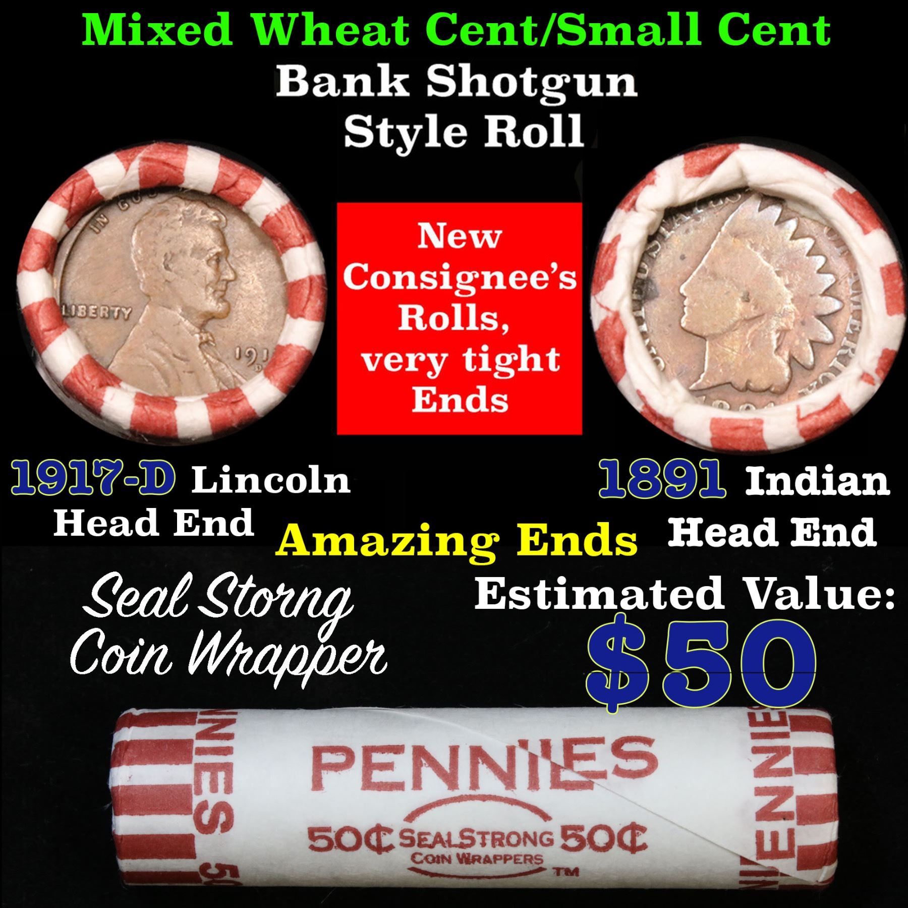Mixed small cents 1c orig shotgun roll, 1917-d Wheat Cent, 1891 Indian Cent other end. The roll is held in an old Seal Strong wrapper. Actual roll pictured is the roll you will get. A great original bank shotgun roll with very tight ends. We have been getting excellent feedback on these rolls. Were being told that close to half the roll are teens, some with mintmarks, there are a few Indians in all the rolls, most of the rolls have steel cents. They seem to be PQ Wheaties rolls. These shotgun rolls are all from a new consignee. They are all frrom one Estate.