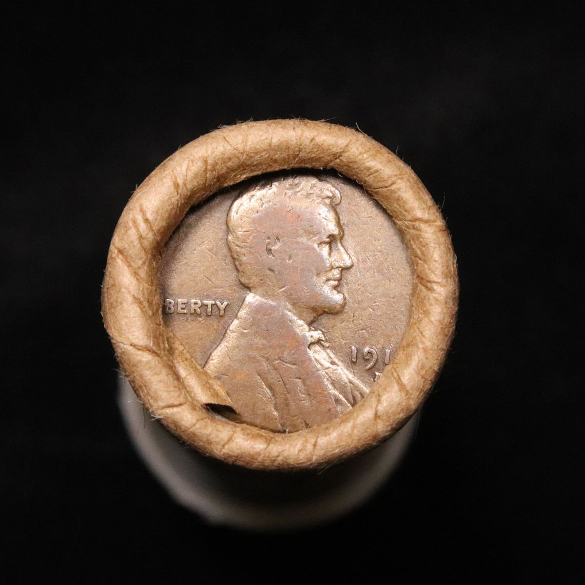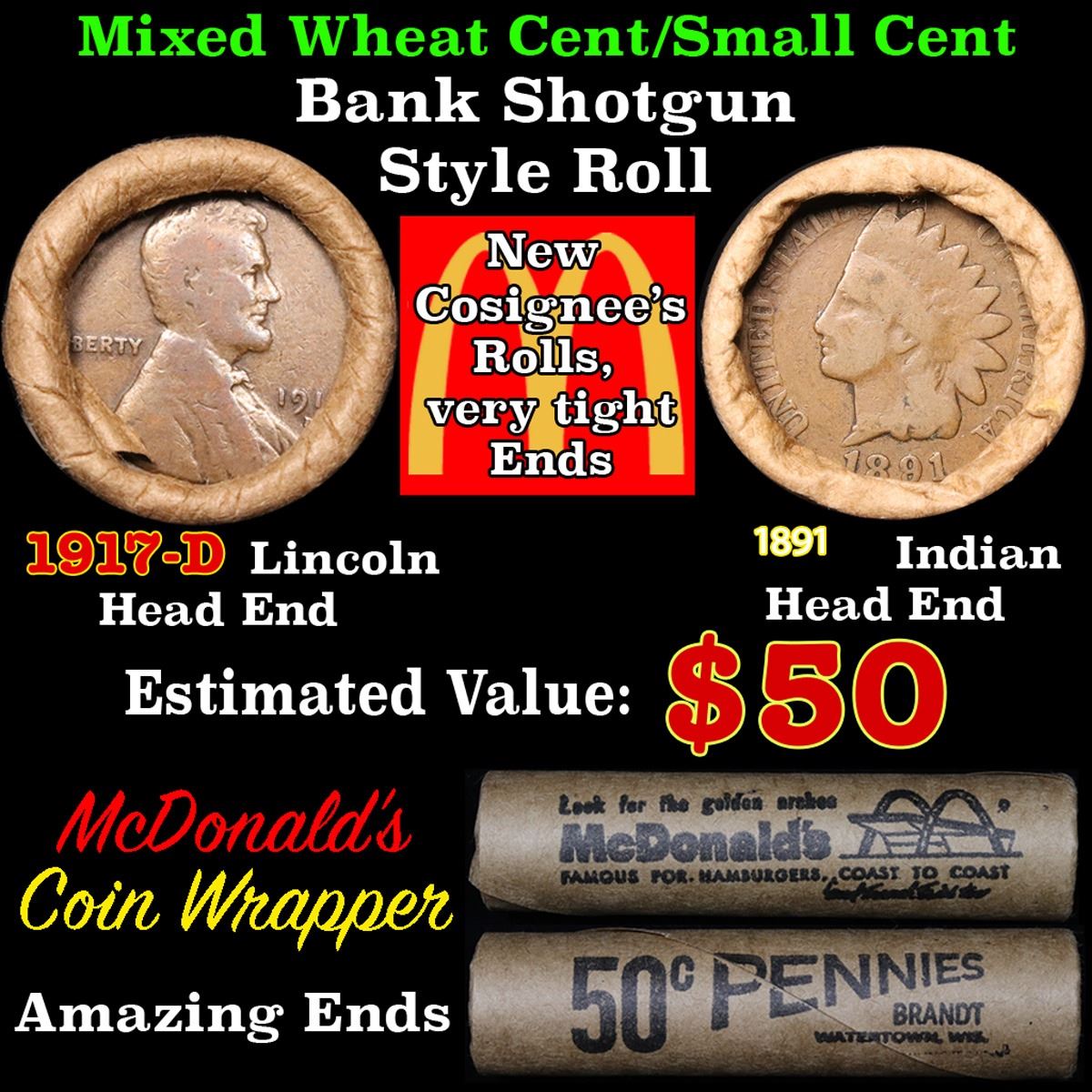 Mixed small cents 1c orig shotgun roll, 1917-d Wheat Cent, 1891 Indian Cent other end . .. The roll is held in an old Rare & Collectable McDonalds Brandt wrapper. Actual roll pictured is the roll you will get. A great original bank shotgun roll with very tight ends. We have opened a few of these rolls. They seem to be mixed small cents including Indians, Wheats, Steel cents & some Flying Eagles mixed in. These shotgun rolls are all from a new consignee. They are all frrom one Estate.