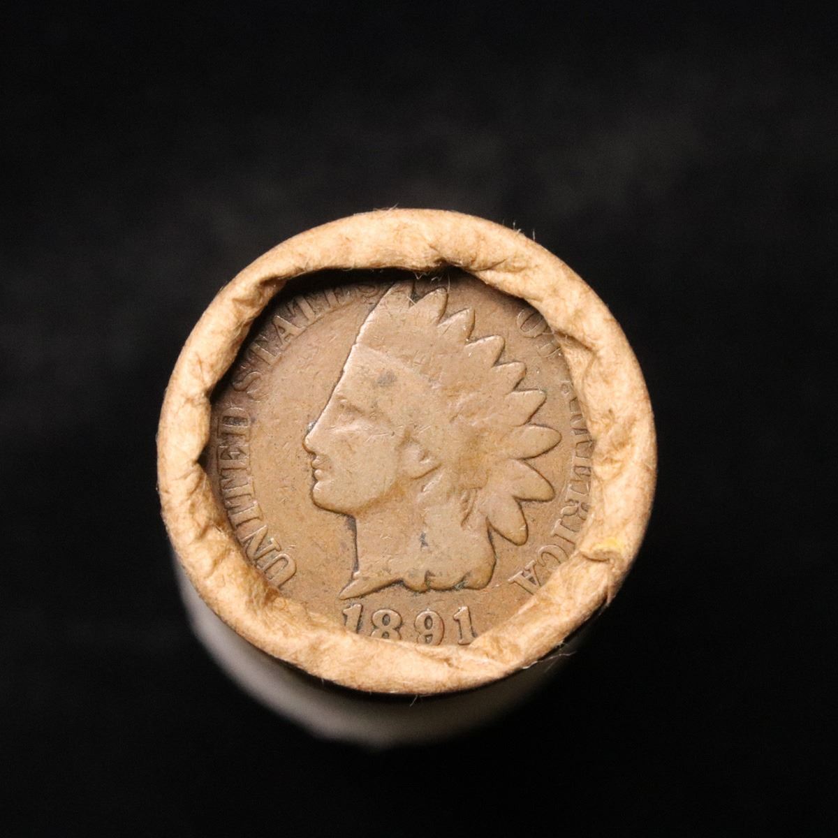 Mixed small cents 1c orig shotgun roll, 1917-d Wheat Cent, 1891 Indian Cent other end