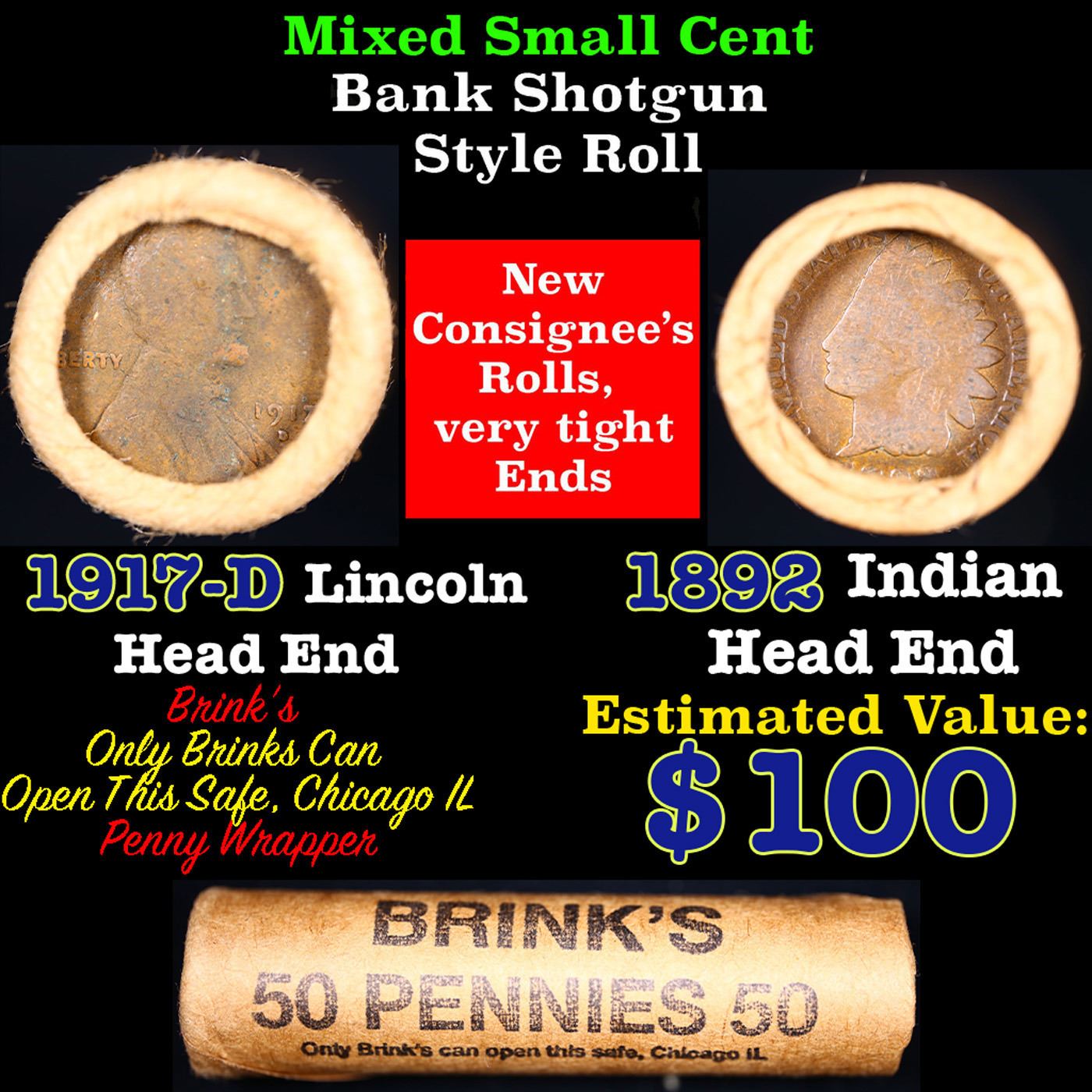 Mixed small cents 1c orig shotgun roll, 1917-d Wheat Cent, 1892 Indian Cent other end, brinks Wr
