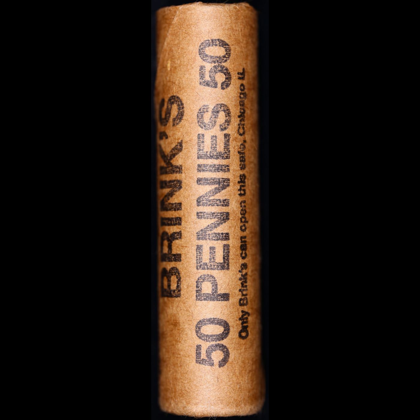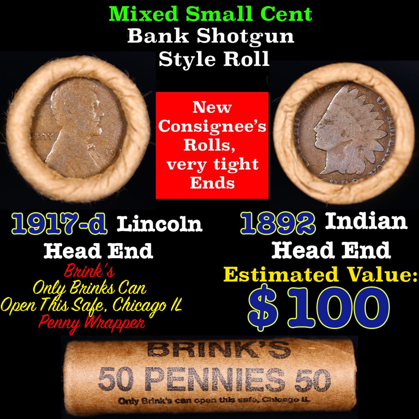 Mixed small cents 1c orig shotgun roll, 1917-d Wheat Cent, 1892 Indian Cent other end, brinks Wrapper. The roll is held in an old Rare & Collectable Brinks 'Only Brinks Can Open This Safe, Chicago IL' Penny wrapper. Actual roll pictured is the roll you will get. A great original bank shotgun roll with very tight ends. We have opened a few of these rolls. They seem to be mixed small cents including Indians, Wheats, Steel cents & some Flying Eagles mixed in. These shotgun rolls are all from a new consignee. They are all frrom one Estate.