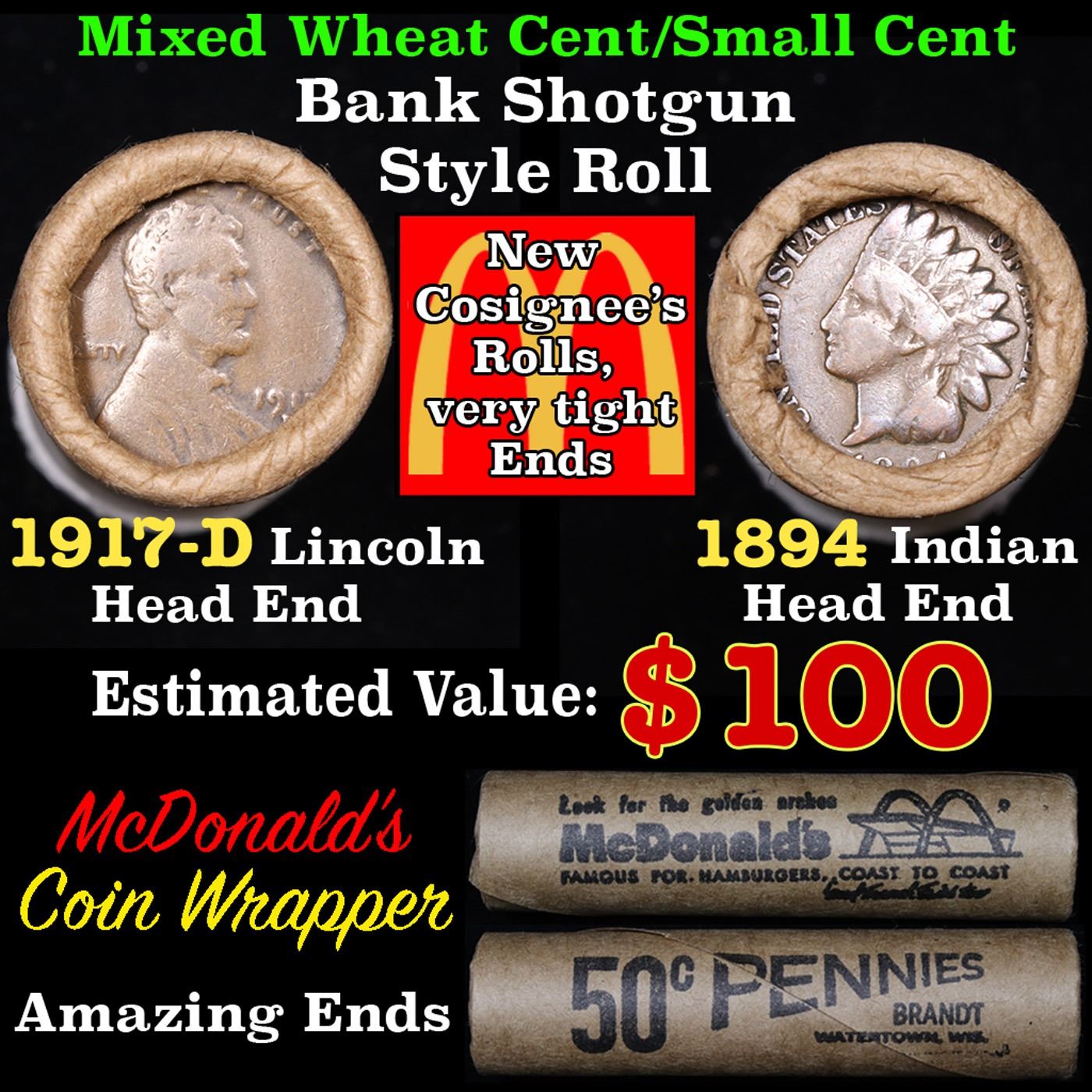 Mixed small cents 1c orig shotgun roll, 1917-d Wheat Cent, 1894 Indian Cent other end, McDonalds Wrapper Grades. The roll is held in an old Rare & Collectable McDonalds Brandt wrapper. Look For The Golden Arches. Actual roll pictured is the roll you will get. A great original bank shotgun roll with very tight ends. We have opened a few of these rolls. They seem to be mixed small cents including Indians, Wheats, Steel cents & some Flying Eagles mixed in. These shotgun rolls are all from a new consignee. They are all frrom one Estate.