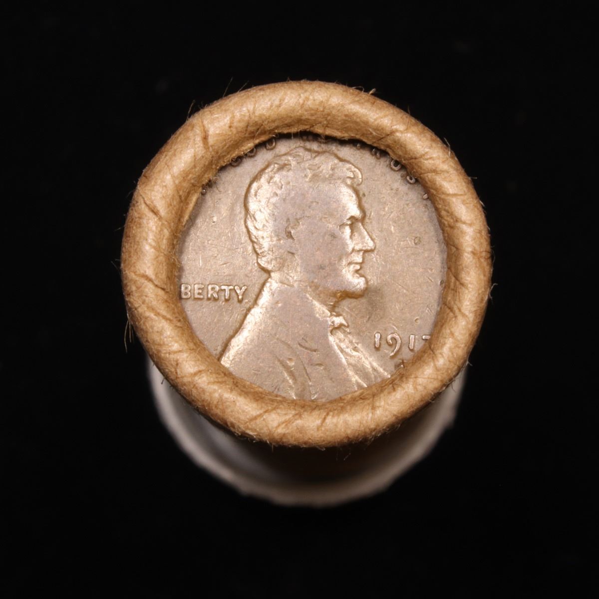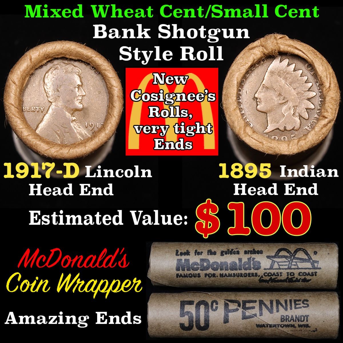 Mixed small cents 1c orig shotgun roll, 1917-d Wheat Cent, 1895 Indian Cent other end, McDonalds Wra