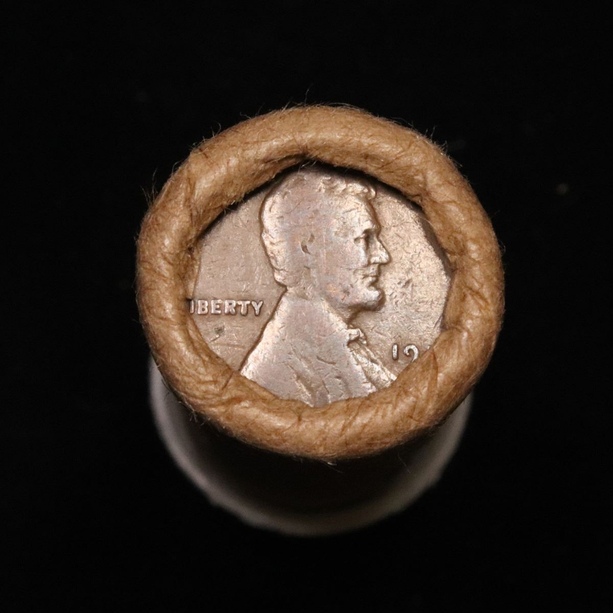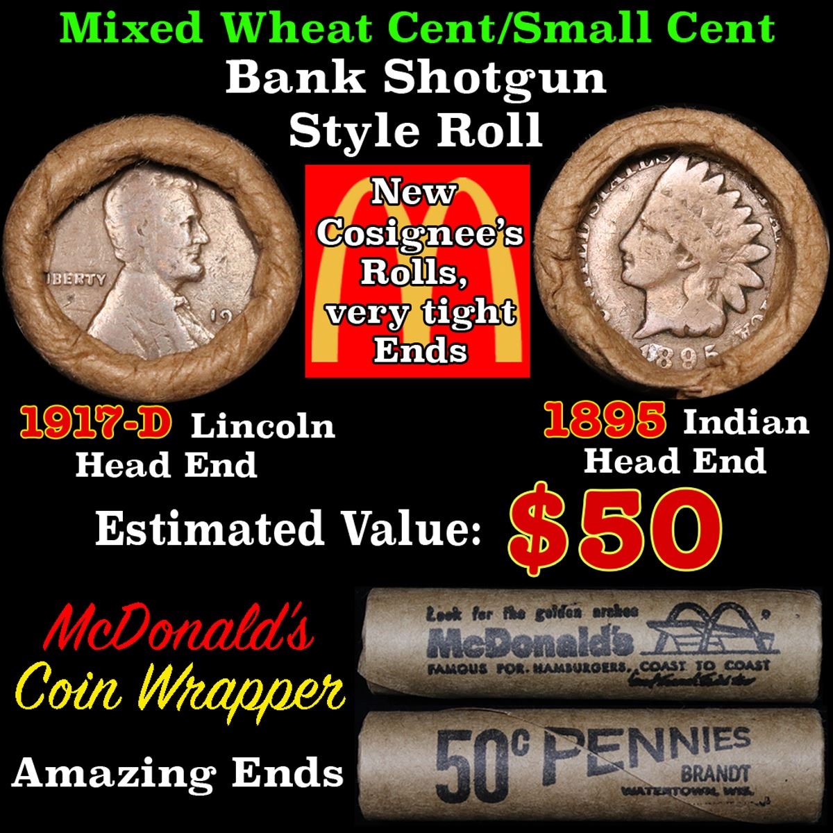 Mixed small cents 1c orig shotgun roll, 1917-d Wheat Cent, 1895 Indian Cent other end . .. The roll is held in an old Rare & Collectable McDonalds Brandt wrapper. Actual roll pictured is the roll you will get. A great original bank shotgun roll with very tight ends. We have opened a few of these rolls. They seem to be mixed small cents including Indians, Wheats, Steel cents & some Flying Eagles mixed in. These shotgun rolls are all from a new consignee. They are all frrom one Estate.