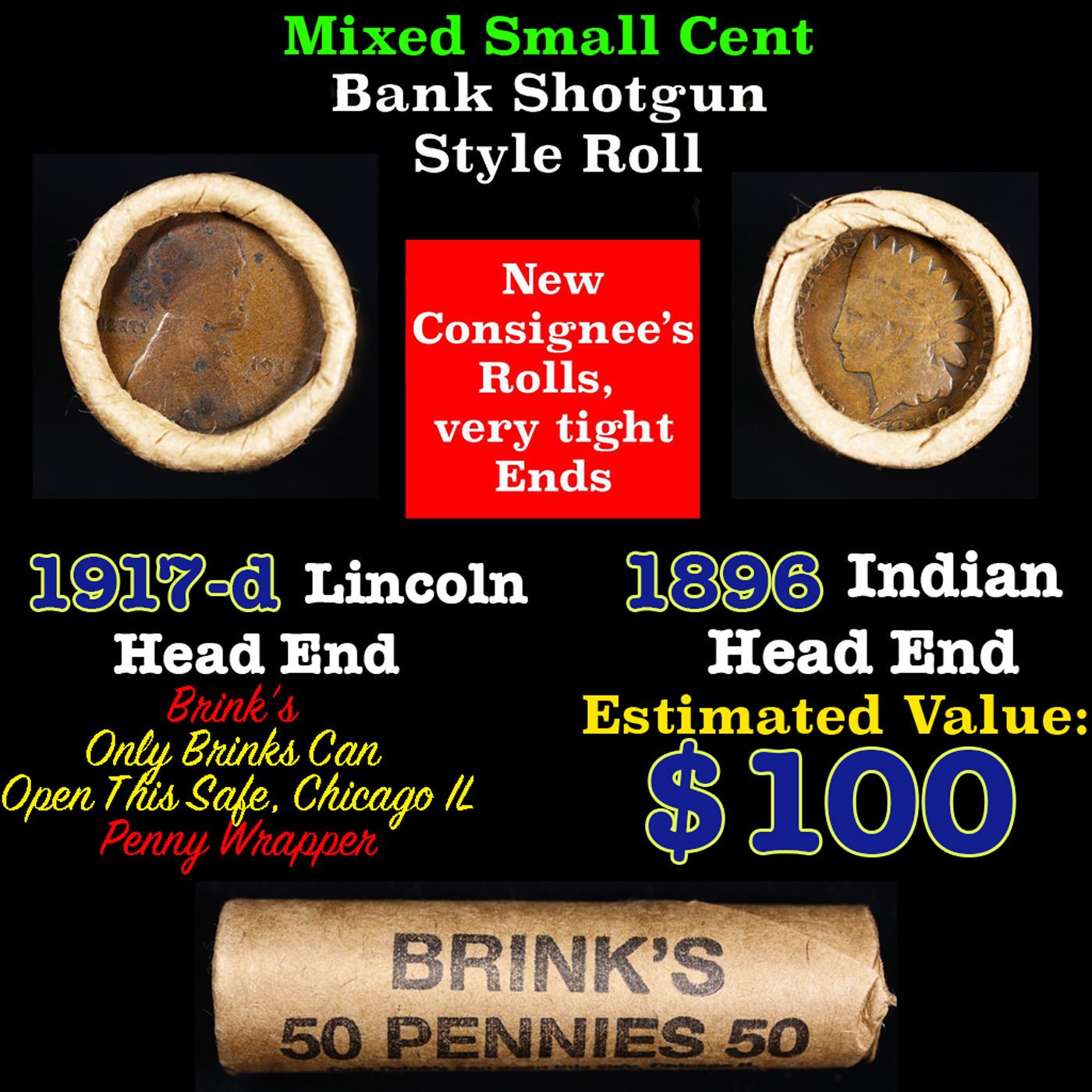 Mixed small cents 1c orig shotgun roll, 1917-d Wheat Cent, 1896 Indian Cent other end, brinks Wrapper. The roll is held in an old Rare & Collectable Brinks 'Only Brinks Can Open This Safe, Chicago IL' Penny wrapper. Actual roll pictured is the roll you will get. A great original bank shotgun roll with very tight ends. We have opened a few of these rolls. They seem to be mixed small cents including Indians, Wheats, Steel cents & some Flying Eagles mixed in. These shotgun rolls are all from a new consignee. They are all frrom one Estate.
