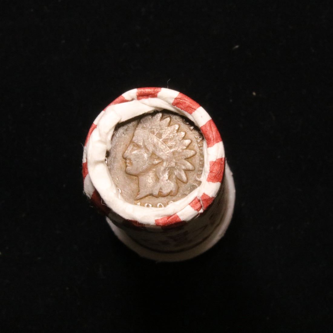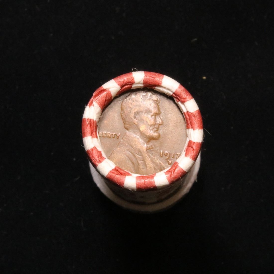 Mixed small cents 1c orig shotgun roll, 1917-d Wheat Cent, 1896 Indian Cent other end. The roll is held in an old Seal Strong wrapper. Actual roll pictured is the roll you will get. A great original bank shotgun roll with very tight ends. We have been getting excellent feedback on these rolls. Were being told that close to half the roll are teens, some with mintmarks, there are a few Indians in all the rolls, most of the rolls have steel cents. They seem to be PQ Wheaties rolls. These shotgun rolls are all from a new consignee. They are all frrom one Estate.