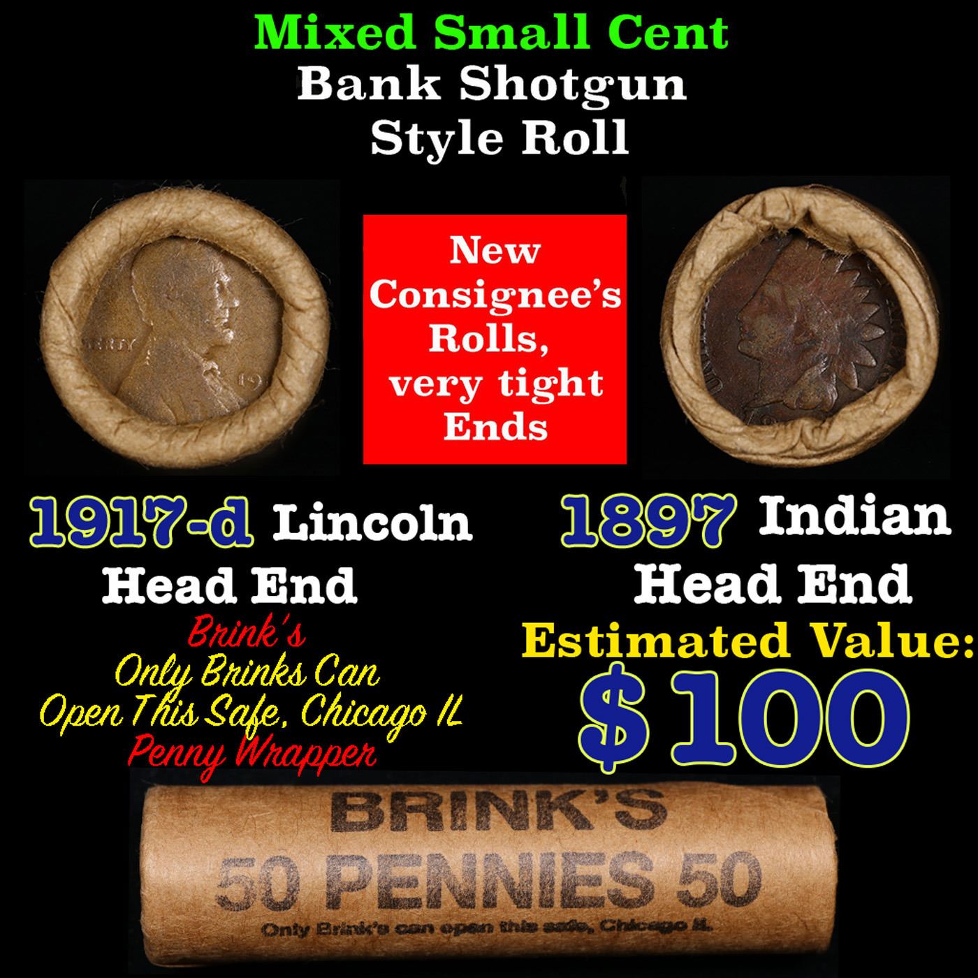 Mixed small cents 1c orig shotgun roll, 1917-d Wheat Cent, 1897 Indian Cent other end, Brinks Wrapper Grades. The roll is held in an old Rare & Collectable Brinks Wrapper. Actual roll pictured is the roll you will get. A great original bank shotgun roll with very tight ends. We have opened a few of these rolls. They seem to be mixed small cents including Indians, Wheats, Steel cents & some Flying Eagles mixed in. These shotgun rolls are all from a new consignee. They are all frrom one Estate.