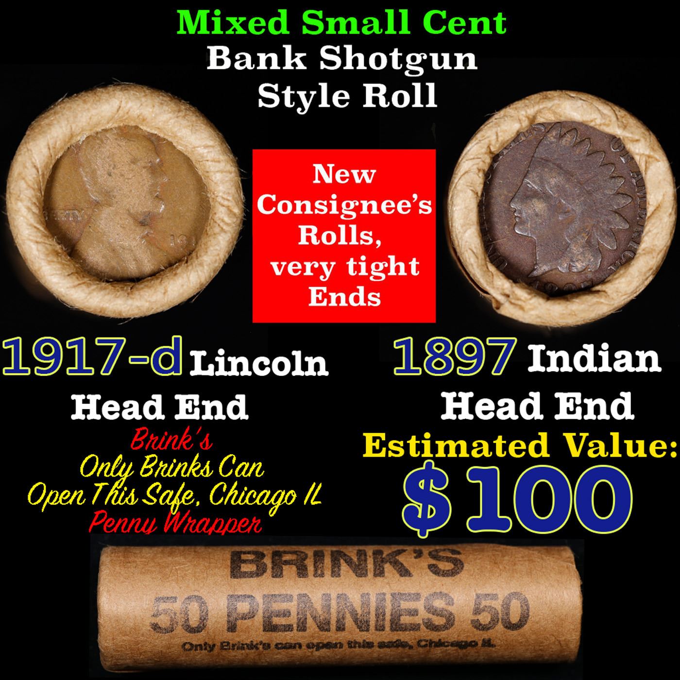 Mixed small cents 1c orig shotgun roll, 1917-d Wheat Cent, 1897 Indian Cent other end, Brinks Wrapper.. The roll is held in an old Rare & Collectable Brinks 'Only Brinks Can Open This Safe, Chicago IL' Penny wrapper. Actual roll pictured is the roll you will get. A great original bank shotgun roll with very tight ends. We have opened a few of these rolls. They seem to be mixed small cents including Indians, Wheats, Steel cents & some Flying Eagles mixed in. These shotgun rolls are all from a new consignee. They are all frrom one Estate.