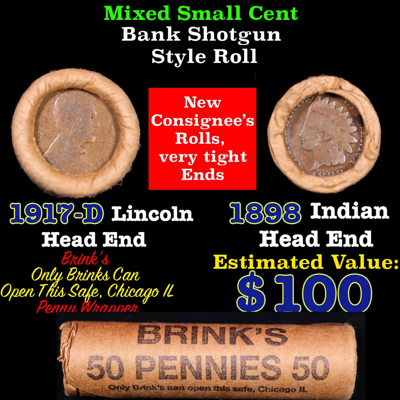 Mixed small cents 1c orig shotgun roll, 1917-d Wheat Cent, 1898 Indian Cent other end, Brinks Wrapper. The roll is held in an old Rare & Collectable Brinks Wrapper. Actual roll pictured is the roll you will get. A great original bank shotgun roll with very tight ends. We have opened a few of these rolls. They seem to be mixed small cents including Indians, Wheats, Steel cents & some Flying Eagles mixed in. These shotgun rolls are all from a new consignee. They are all frrom one Estate.