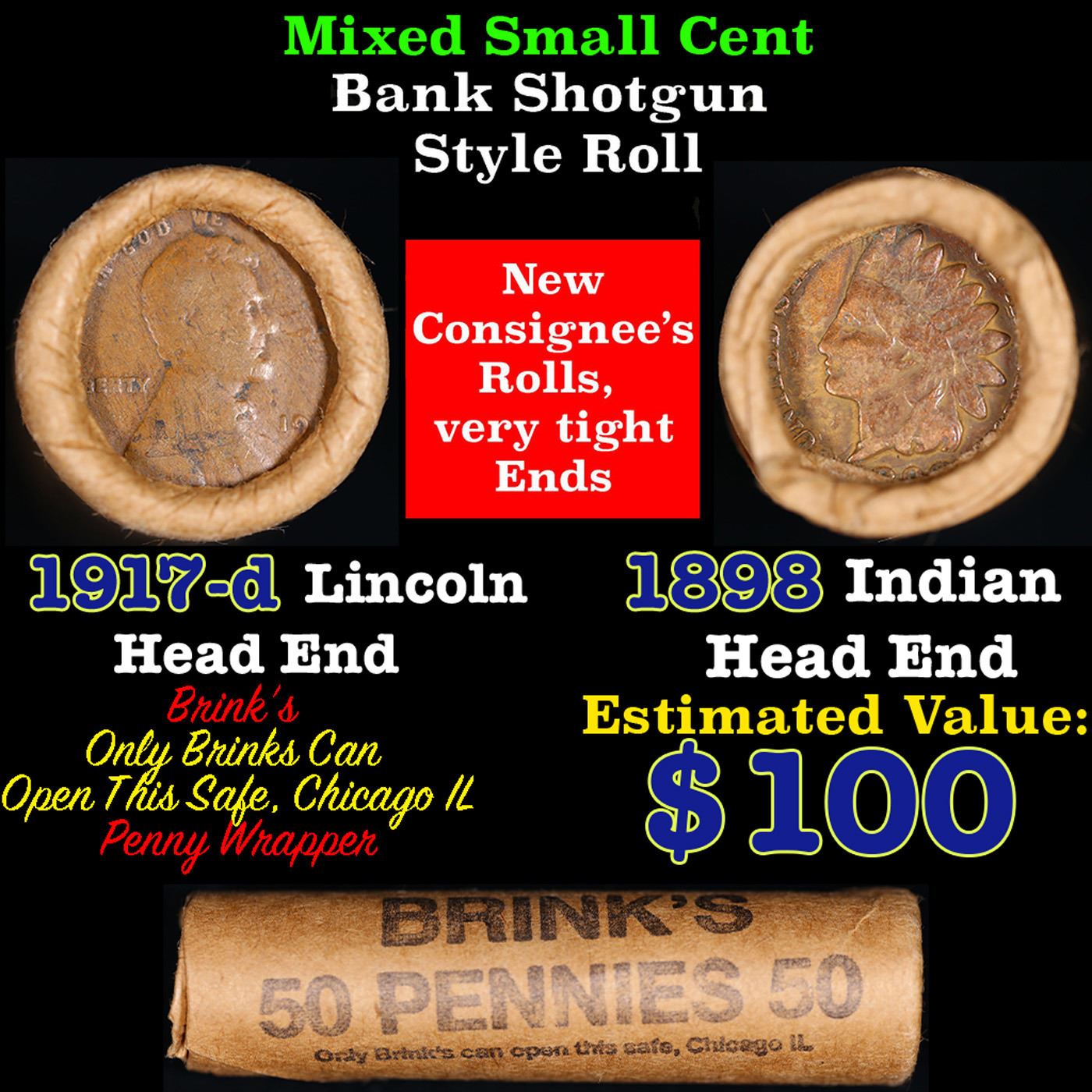Mixed small cents 1c orig shotgun roll, 1917-d Wheat Cent, 1898 Indian Cent other end, Brinks Wrapper Grades. The roll is held in an old Rare & Collectable Brinks Wrapper. Actual roll pictured is the roll you will get. A great original bank shotgun roll with very tight ends. We have opened a few of these rolls. They seem to be mixed small cents including Indians, Wheats, Steel cents & some Flying Eagles mixed in. These shotgun rolls are all from a new consignee. They are all frrom one Estate.