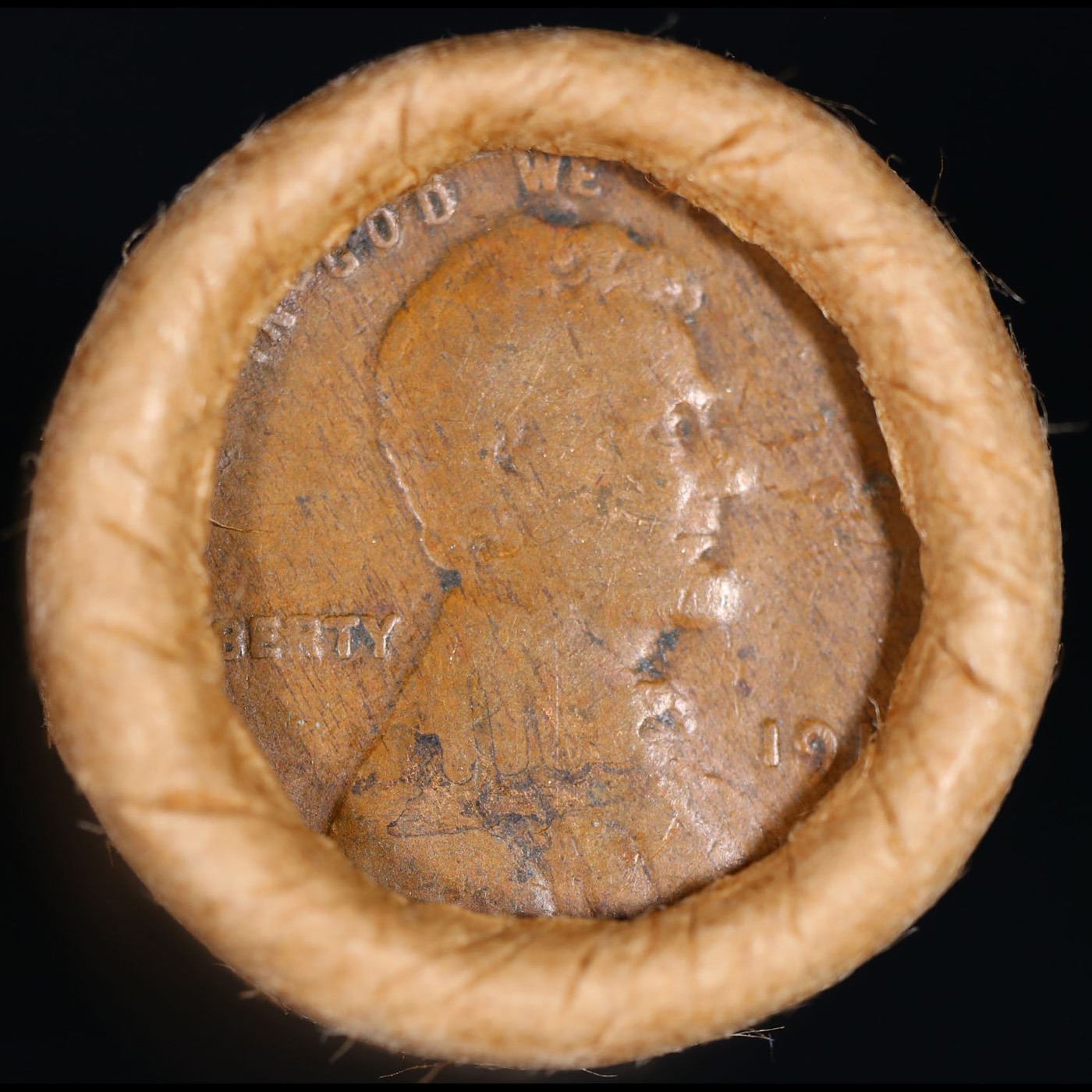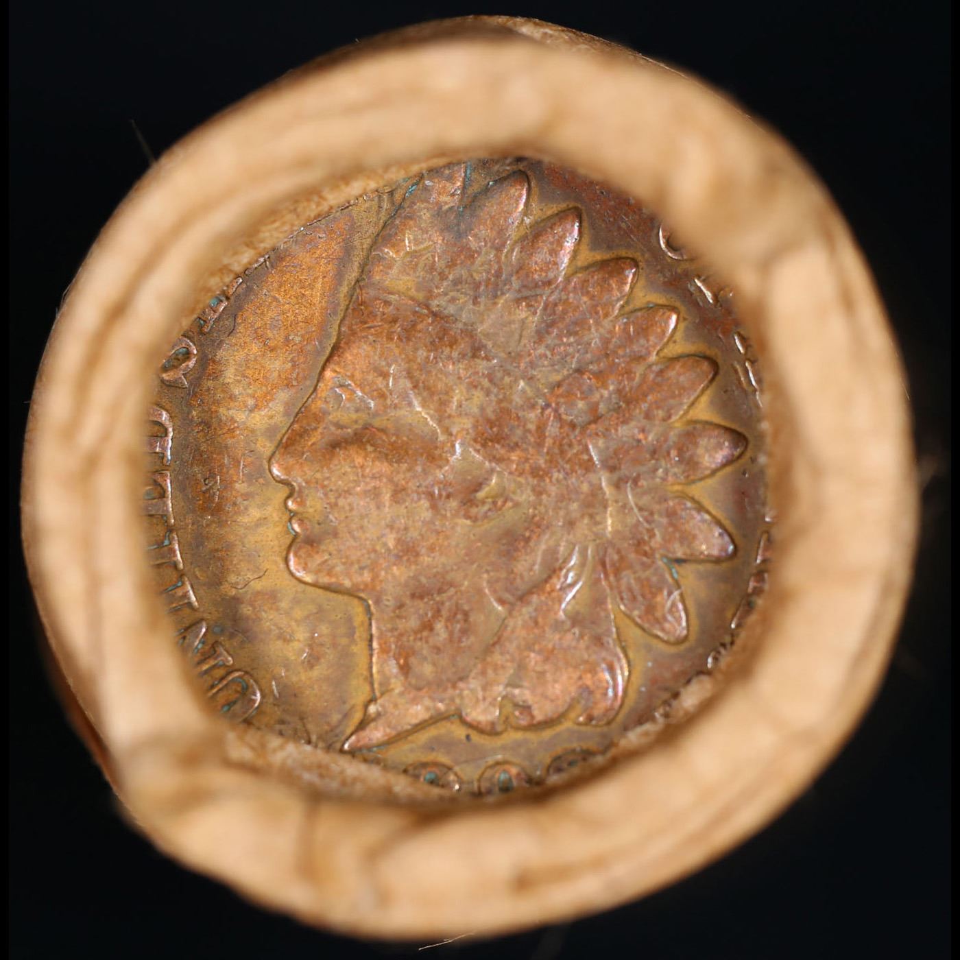 Mixed small cents 1c orig shotgun roll, 1917-d Wheat Cent, 1898 Indian Cent other end, Brinks Wrappe