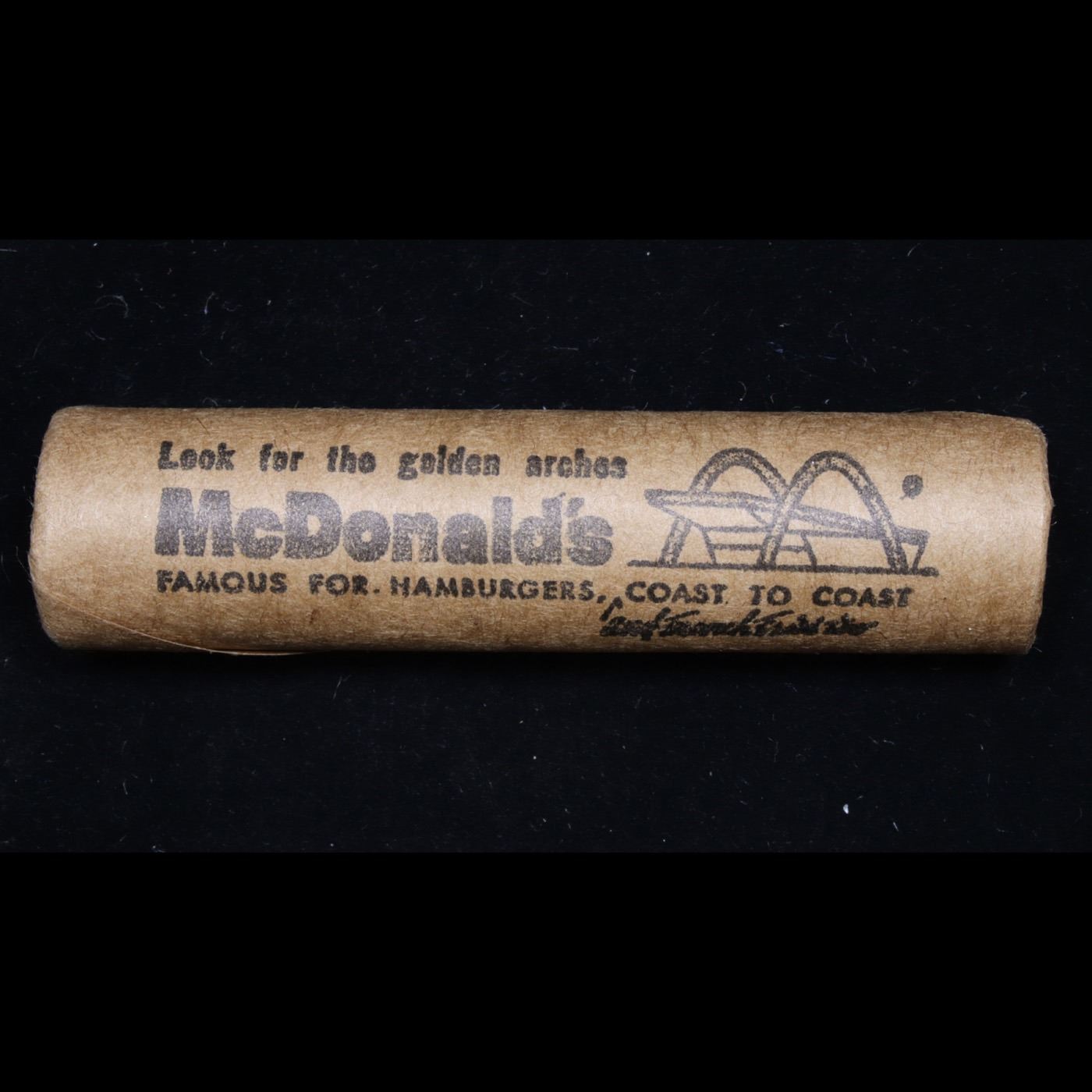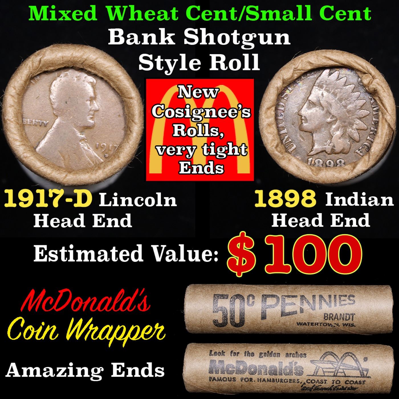 Mixed small cents 1c orig shotgun roll, 1917-d Wheat Cent, 1898 Indian Cent other end, McDnalds Wrapper Grades. The roll is held in an old Rare & Collectable McDonalds Brandt wrapper. Look For The Golden Arches. Actual roll pictured is the roll you will get. A great original bank shotgun roll with very tight ends. We have opened a few of these rolls. They seem to be mixed small cents including Indians, Wheats, Steel cents & some Flying Eagles mixed in. These shotgun rolls are all from a new consignee. They are all frrom one Estate.