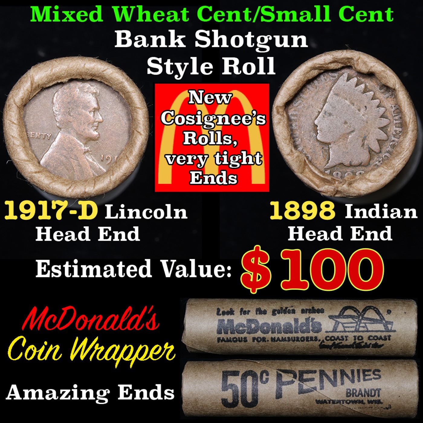 Mixed small cents 1c orig shotgun roll, 1917-d Wheat Cent, 1898 Indian Cent other end,McDnalds Wrapper. The roll is held in an old Rare & Collectable McDonalds Brandt wrapper. Look For The Golden Arches. Actual roll pictured is the roll you will get. A great original bank shotgun roll with very tight ends. We have opened a few of these rolls. They seem to be mixed small cents including Indians, Wheats, Steel cents & some Flying Eagles mixed in. These shotgun rolls are all from a new consignee. They are all frrom one Estate.
