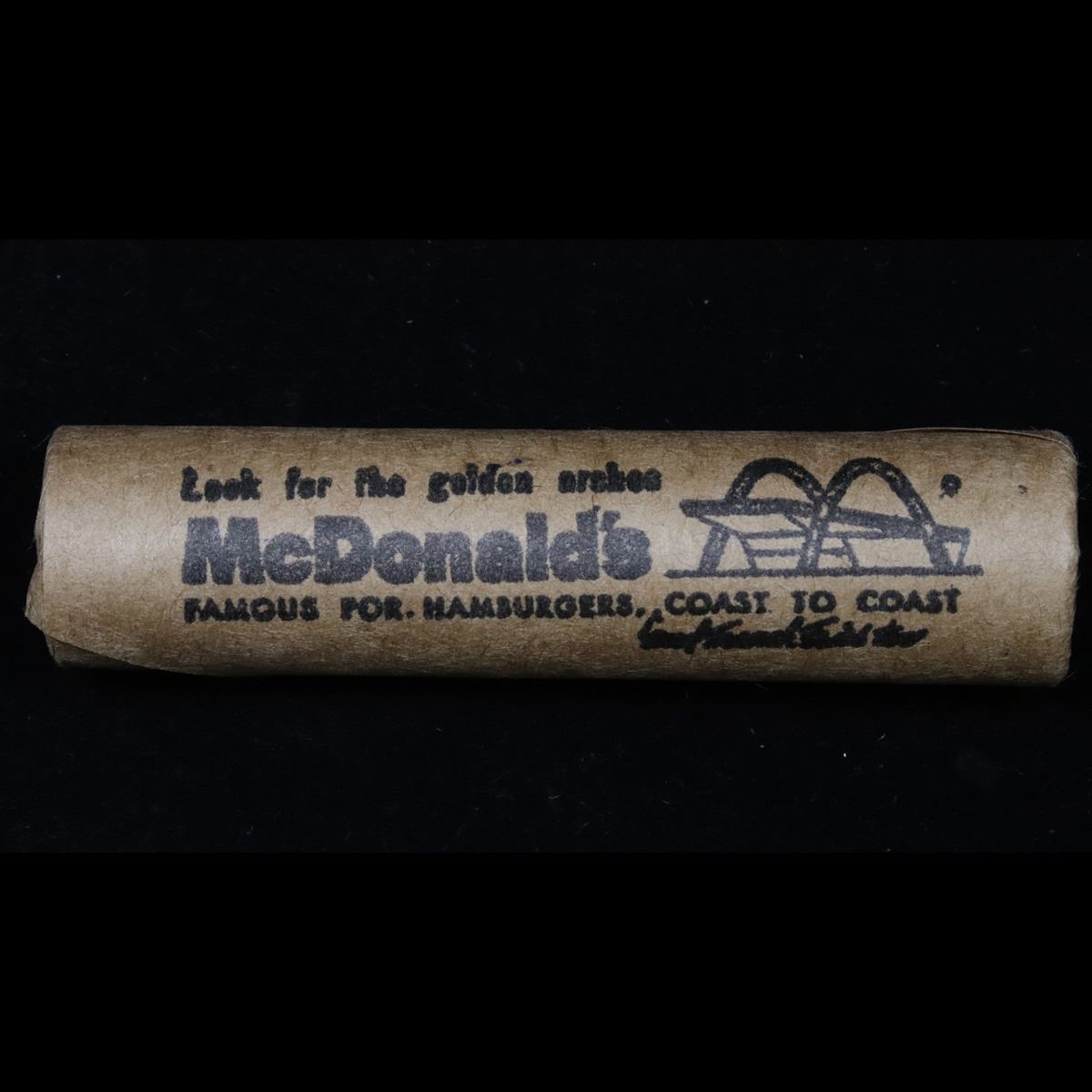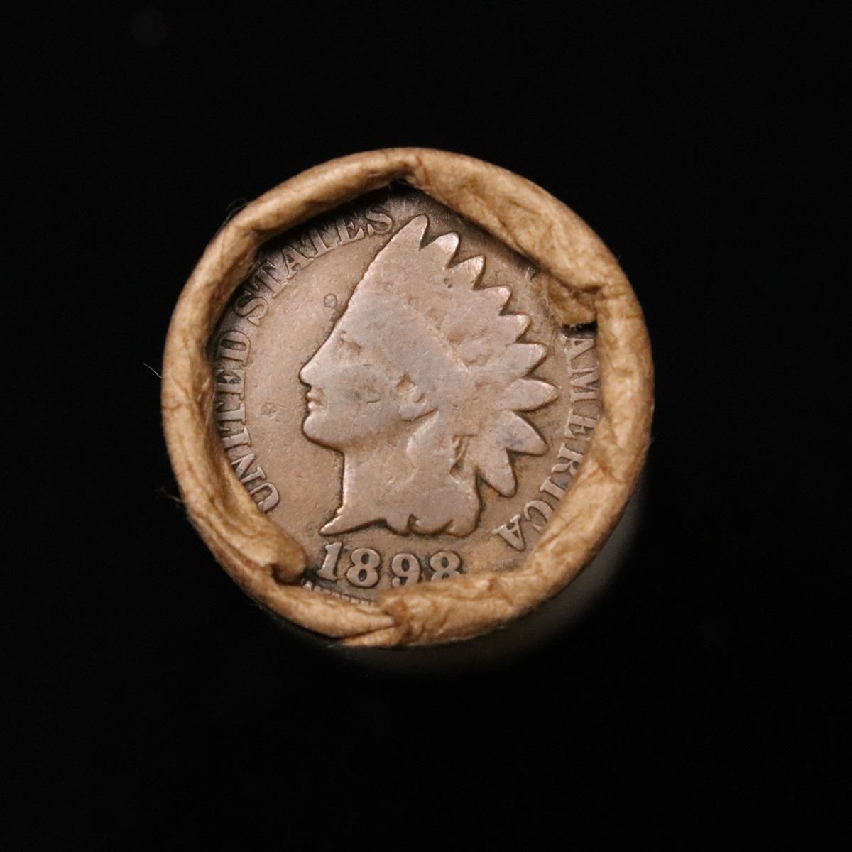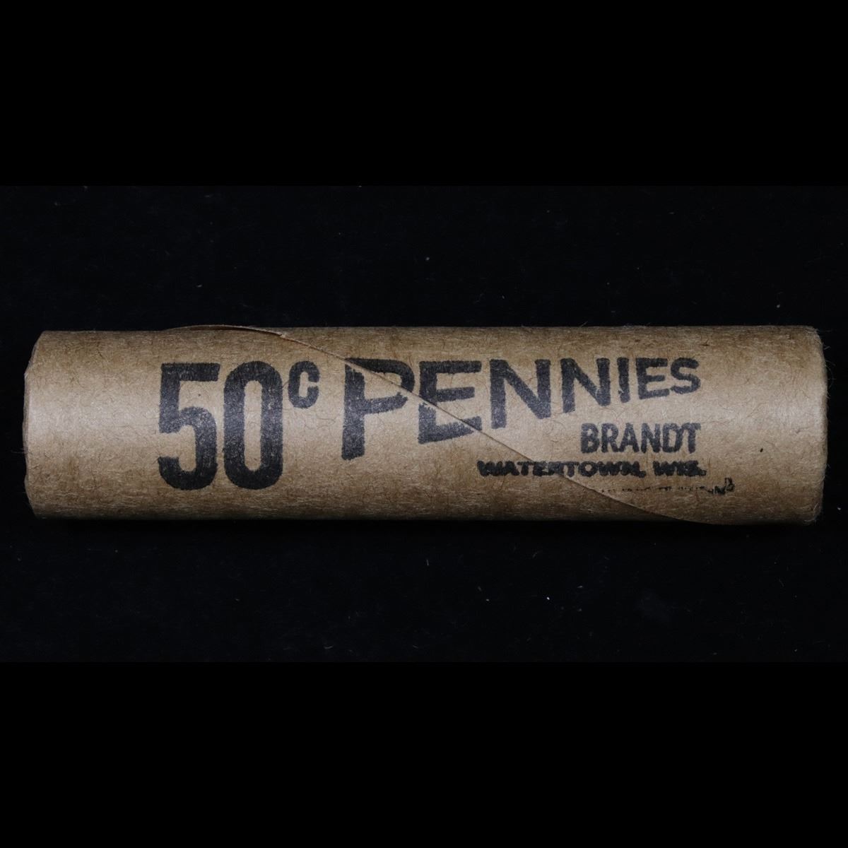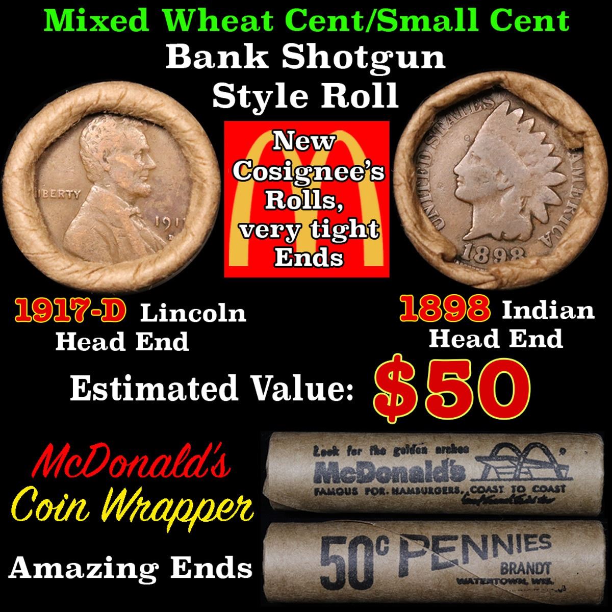 Mixed small cents 1c orig shotgun roll, 1917-d Wheat Cent, 1898 Indian Cent other end . .. The roll is held in an old Rare & Collectable McDonalds Brandt wrapper. Actual roll pictured is the roll you will get. A great original bank shotgun roll with very tight ends. We have opened a few of these rolls. They seem to be mixed small cents including Indians, Wheats, Steel cents & some Flying Eagles mixed in. These shotgun rolls are all from a new consignee. They are all frrom one Estate.