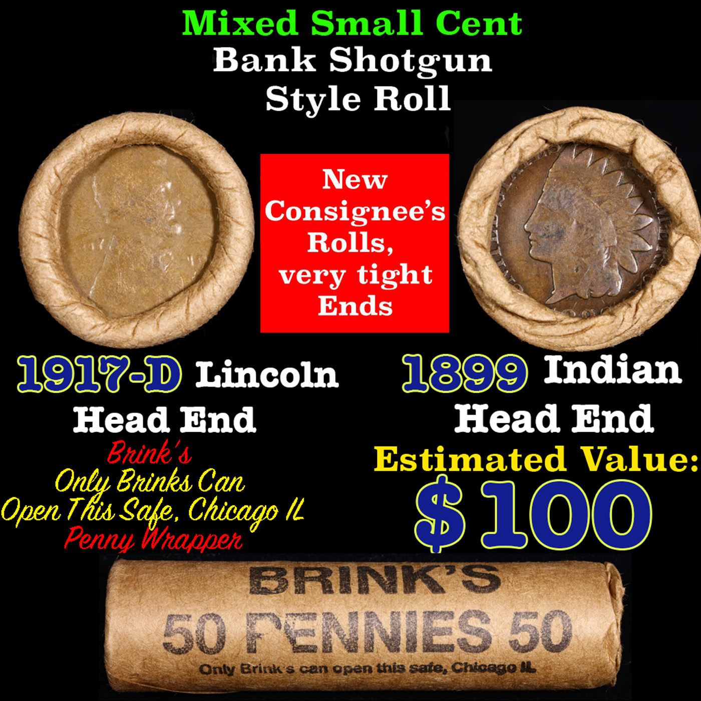Mixed small cents 1c orig shotgun roll, 1917-d Wheat Cent, 1899 Indian Cent other end, Brinks Wrapper. The roll is held in an old Rare & Collectable Brinks Wrapper. Actual roll pictured is the roll you will get. A great original bank shotgun roll with very tight ends. We have opened a few of these rolls. They seem to be mixed small cents including Indians, Wheats, Steel cents & some Flying Eagles mixed in. These shotgun rolls are all from a new consignee. They are all frrom one Estate.
