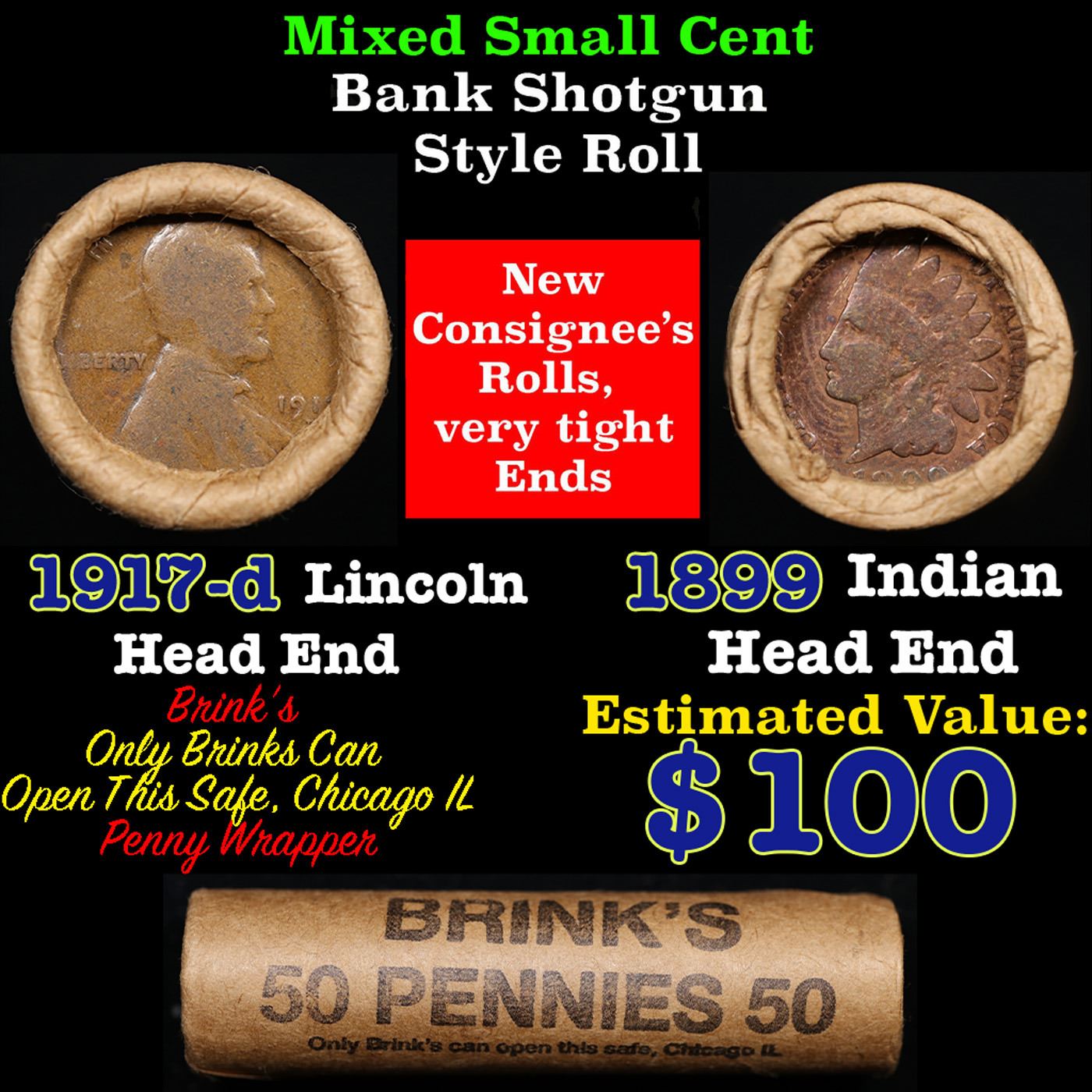 Mixed small cents 1c orig shotgun roll, 1917-d Wheat Cent, 1899 Indian Cent other end, Brinks Wrapper. The roll is held in an old Rare & Collectable Brinks Wrapper. Actual roll pictured is the roll you will get. A great original bank shotgun roll with very tight ends. We have opened a few of these rolls. They seem to be mixed small cents including Indians, Wheats, Steel cents & some Flying Eagles mixed in. These shotgun rolls are all from a new consignee. They are all frrom one Estate.